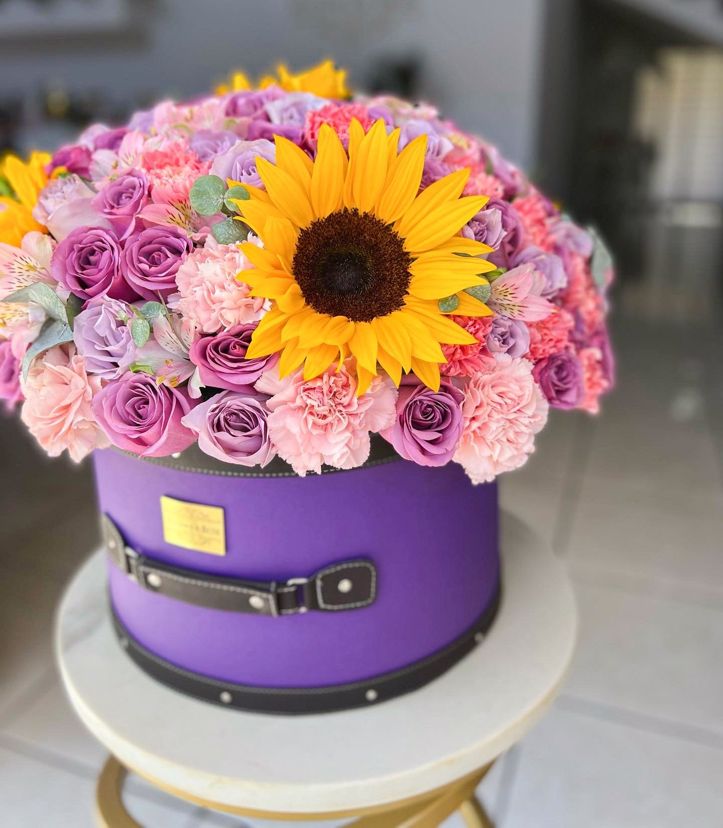 Nuestro arreglo viene diseñado en una caja de cuero con morado, girasoles, claveles