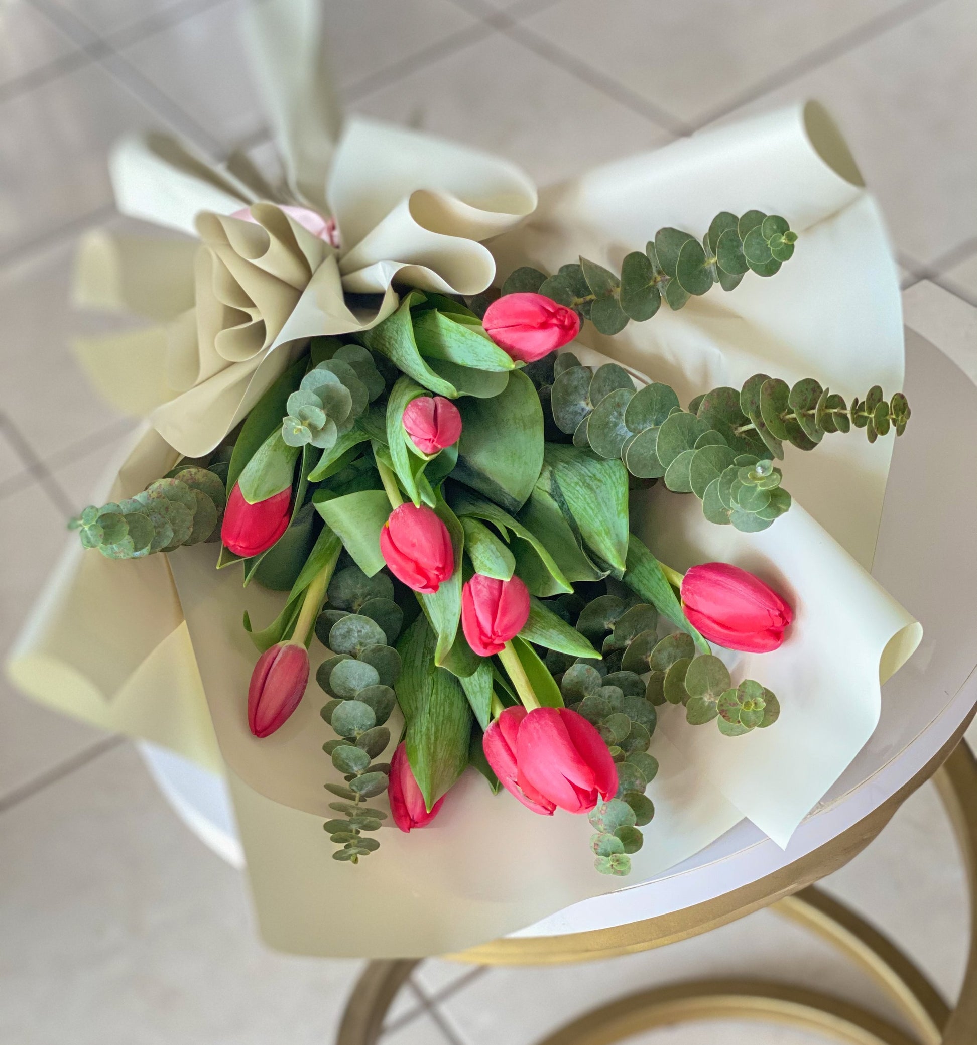 Bouquet hecho de solamente tulipanes en tonos rojo o mixto