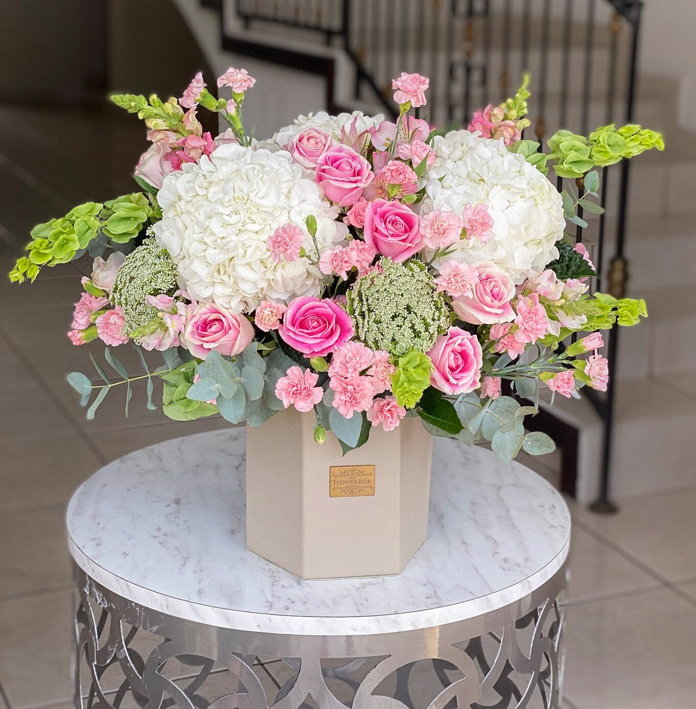 Te presentamos nuestro elegante arreglo, Le Garden. Está diseñado con rosas, hortensias, y una elegante caja hexagonal beige.