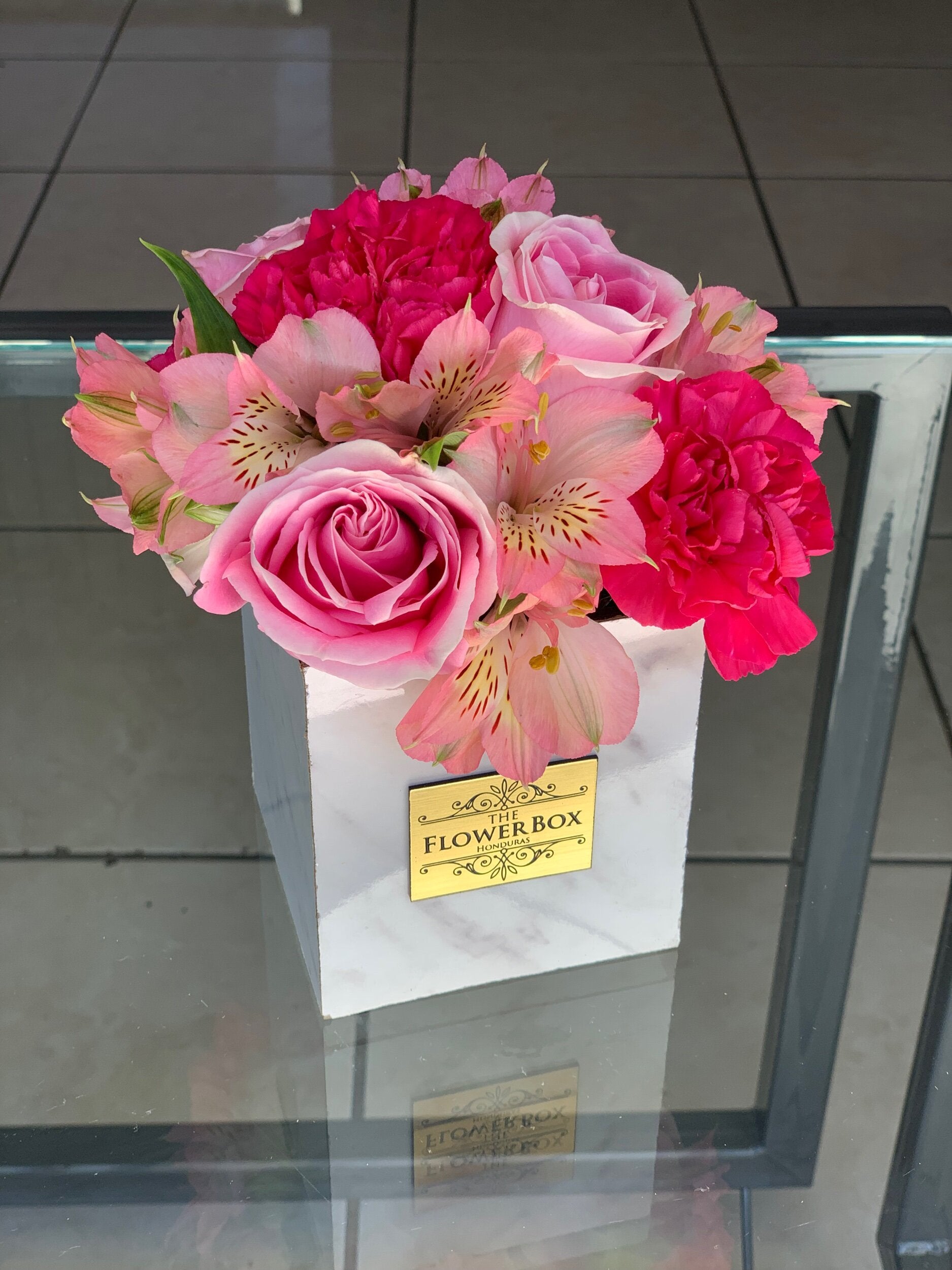 Nuestro arreglo disponible en una sofisticada caja de mármol blanco con flores mixtas y frescas.
