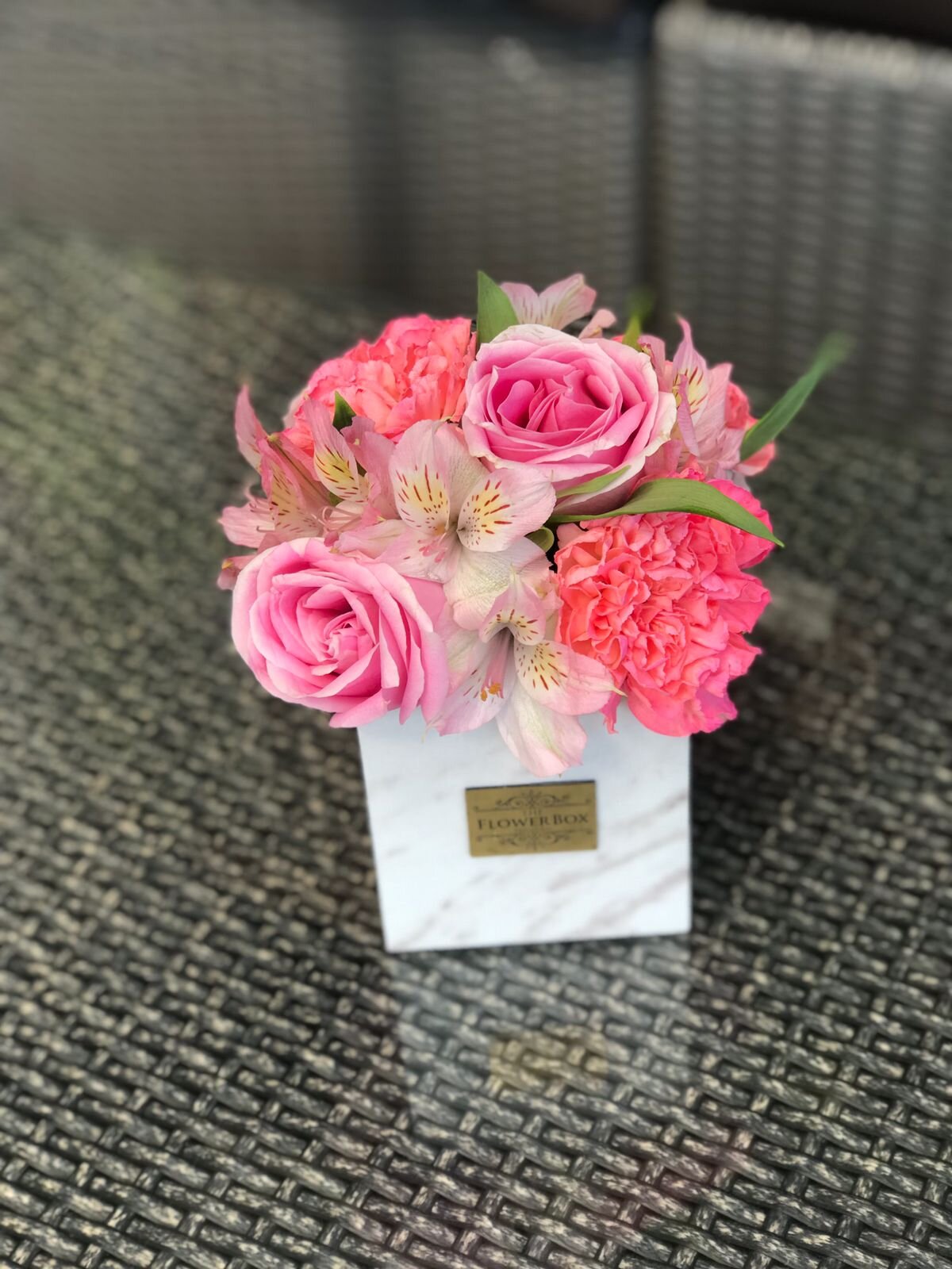 Nuestro arreglo disponible en una sofisticada caja de mármol blanco con flores mixtas y frescas.