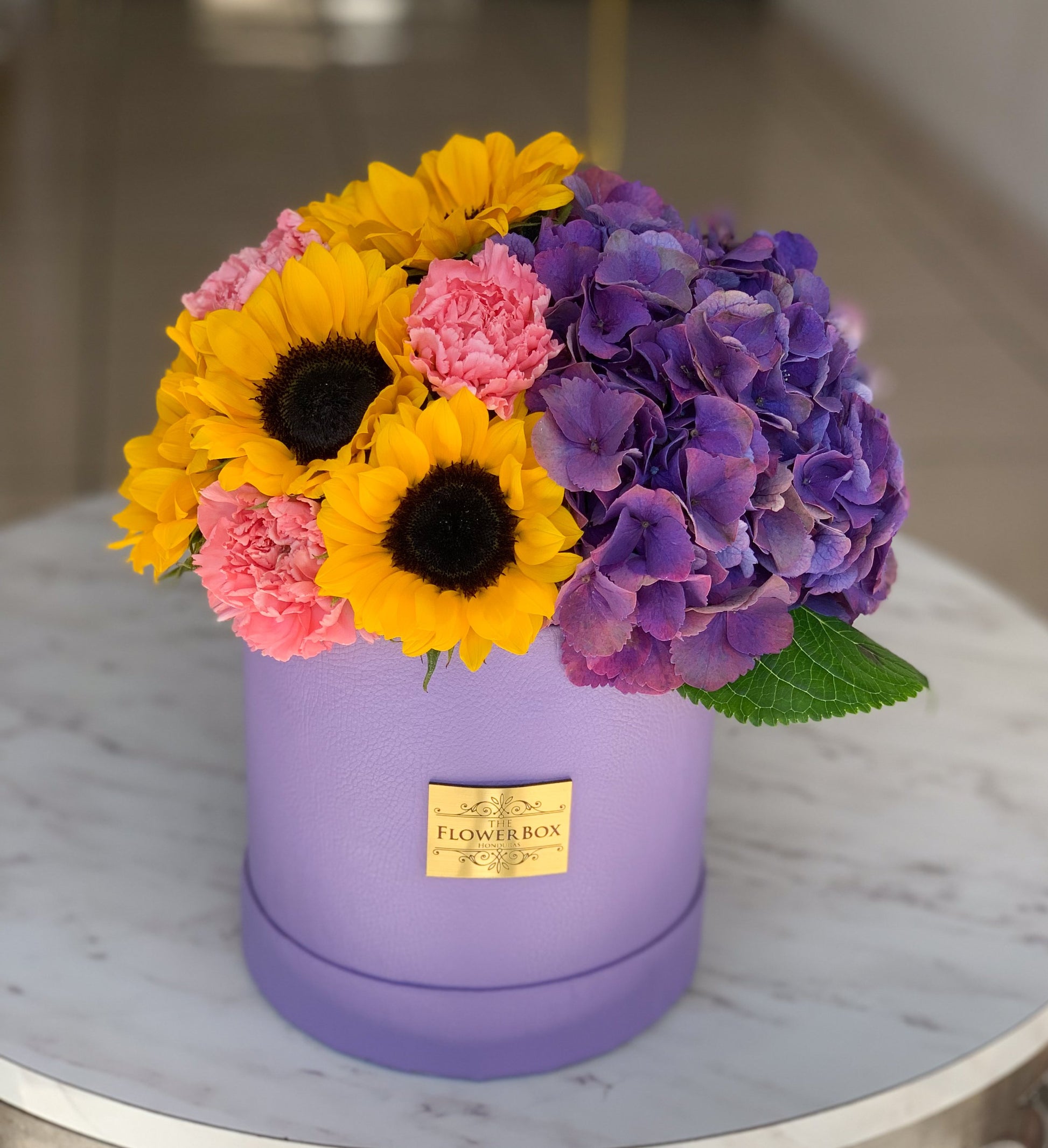Nuestra caja disponible en una sofisticada caja de cuero morado con girasoles, claveles y hortensias