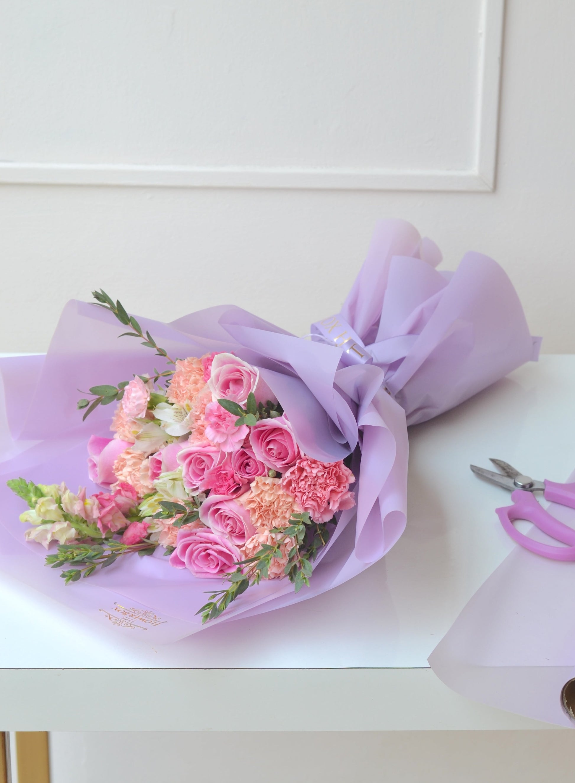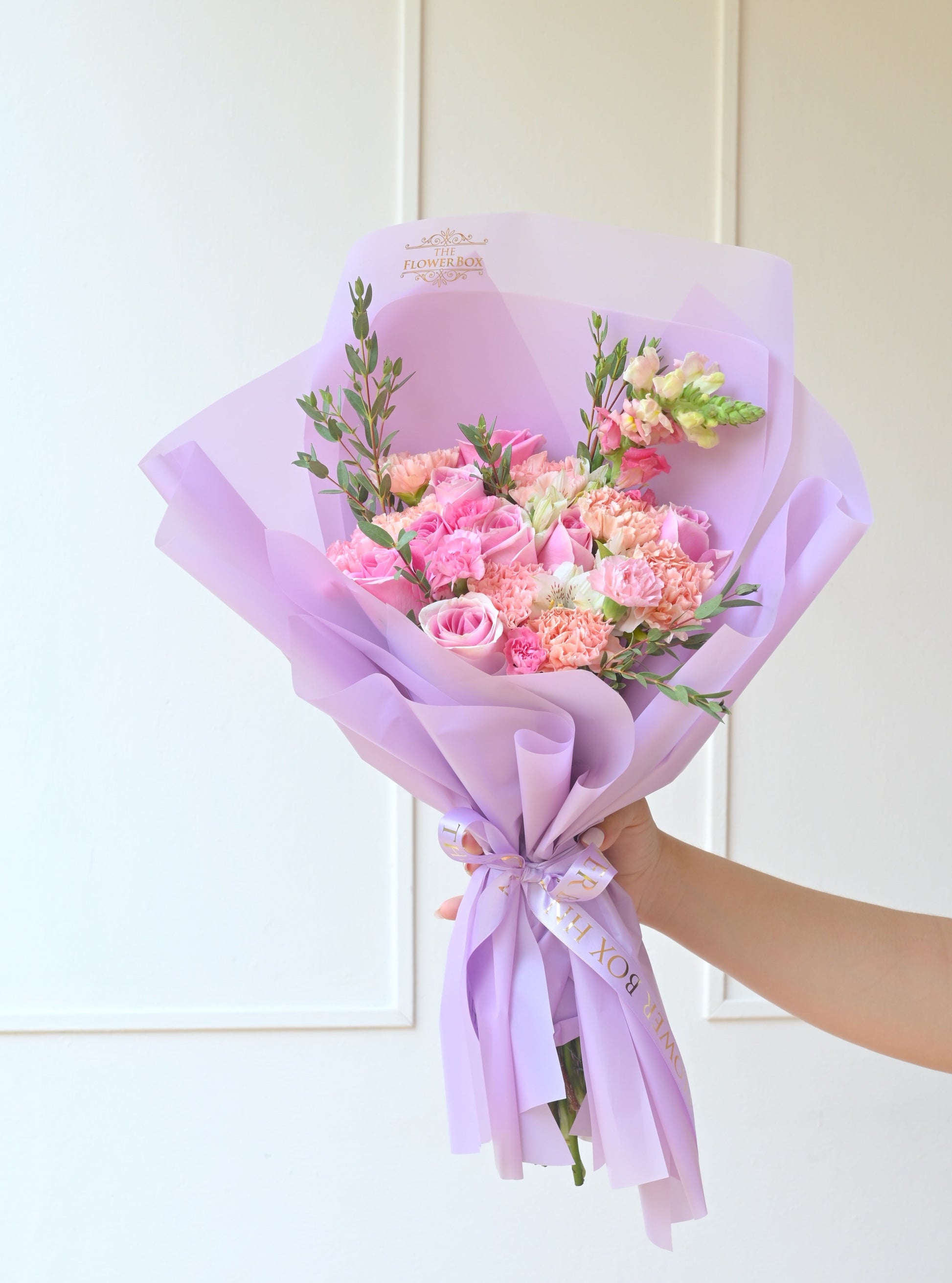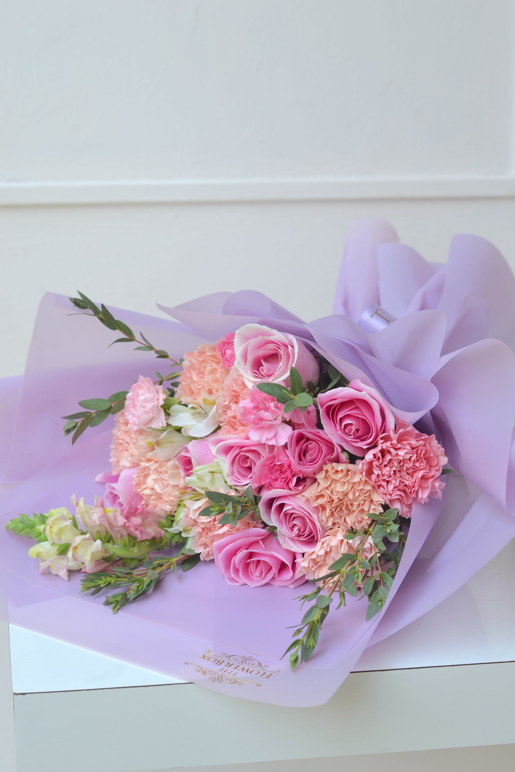 Deslumbra con nuestro exquisito ramo en tonos morados, adornado con rosas en tono rosa y claveles en delicados tonos de peach. Esta combinación armoniosa evoca elegancia y sofisticación, perfecta para expresar afecto y admiración