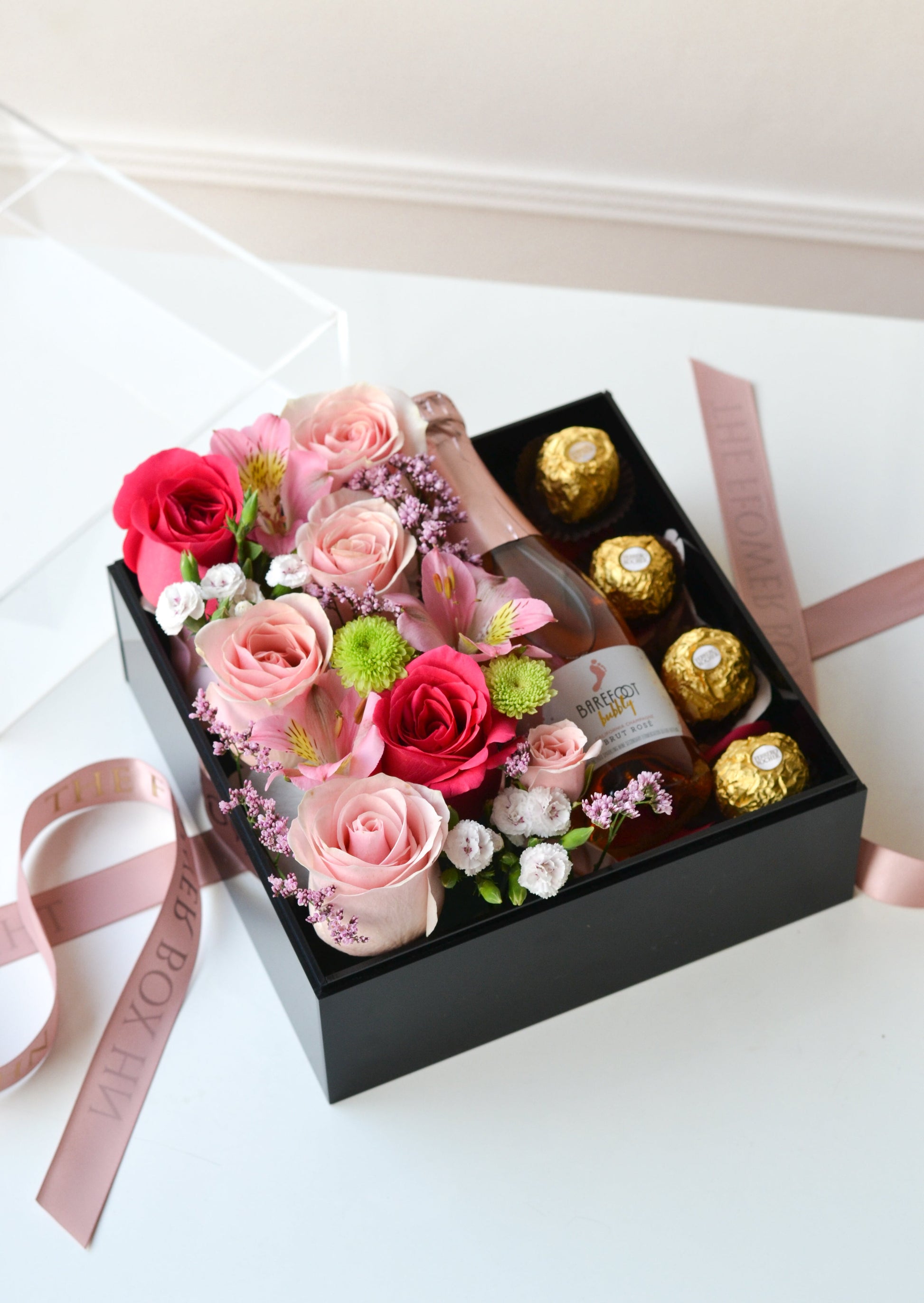 Este arreglo floral es la forma perfecta de demostrar tus sentimientos de amor y apreciación en cualquier ocasión especial. Además, la combinación de flores, chocolates y una mini botella de prosecco lo hacen un regalo excepcionalmente especial y único. El arreglo viene en una caja negra elegante con una base de acrílico, asegurando que se vea espectacular en cualquier espacio.