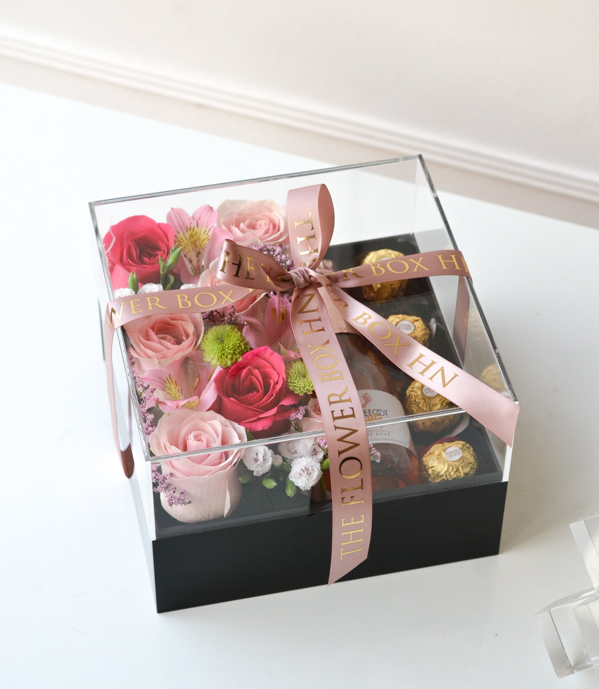 Este arreglo floral es la forma perfecta de demostrar tus sentimientos de amor y apreciación en cualquier ocasión especial. Además, la combinación de flores, chocolates y una mini botella de prosecco lo hacen un regalo excepcionalmente especial y único. El arreglo viene en una caja negra elegante con una base de acrílico, asegurando que se vea espectacular en cualquier espacio.