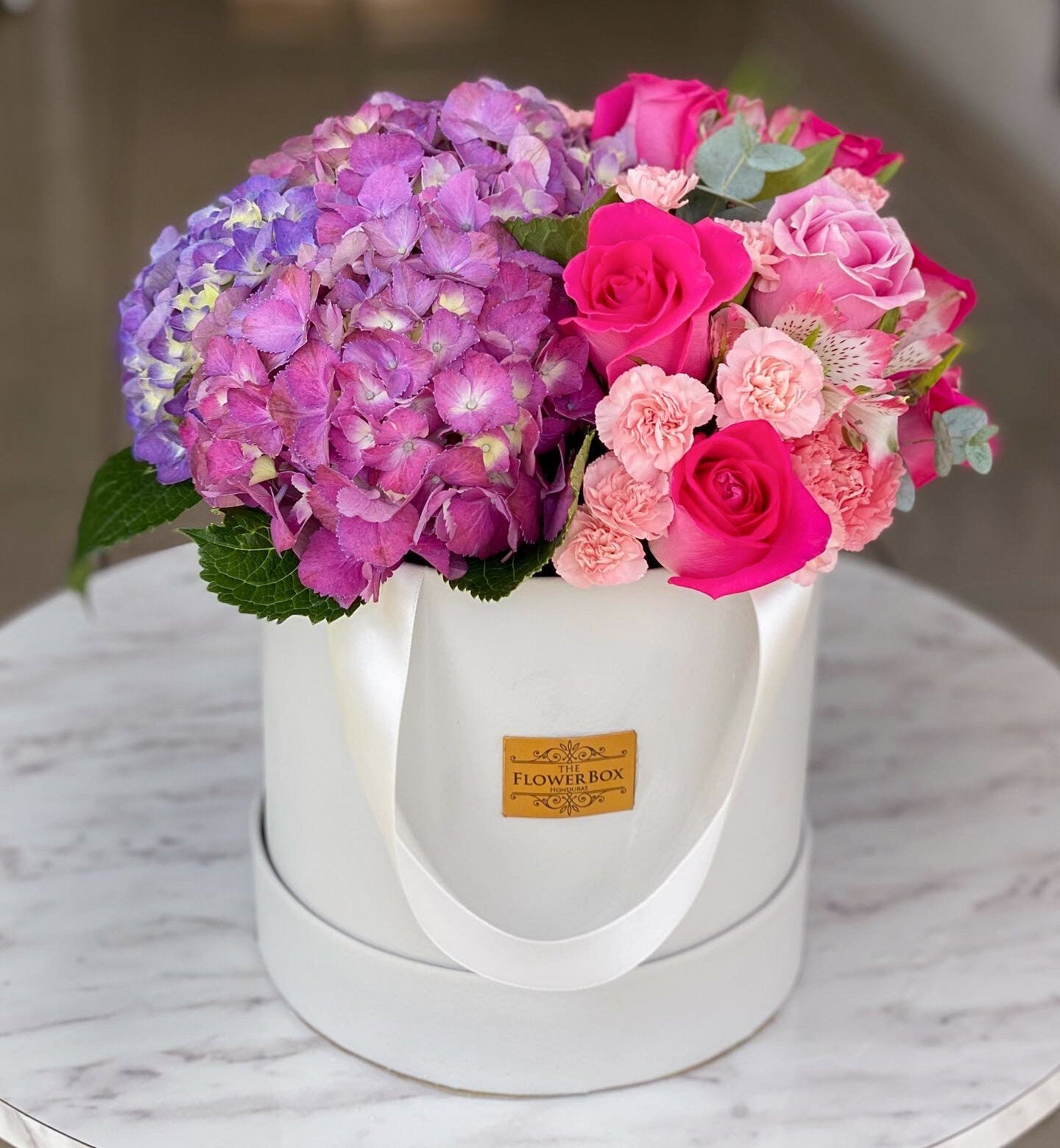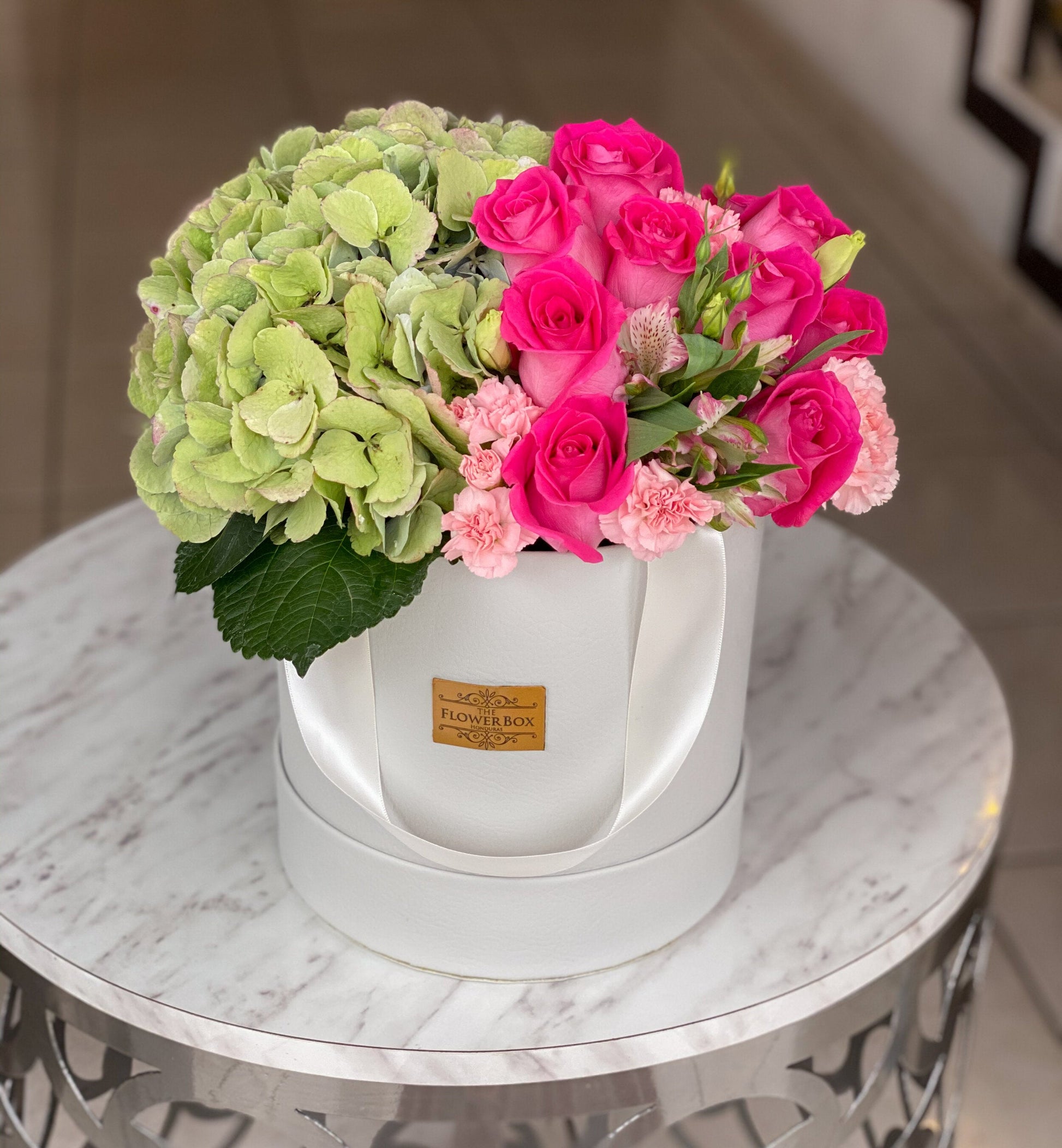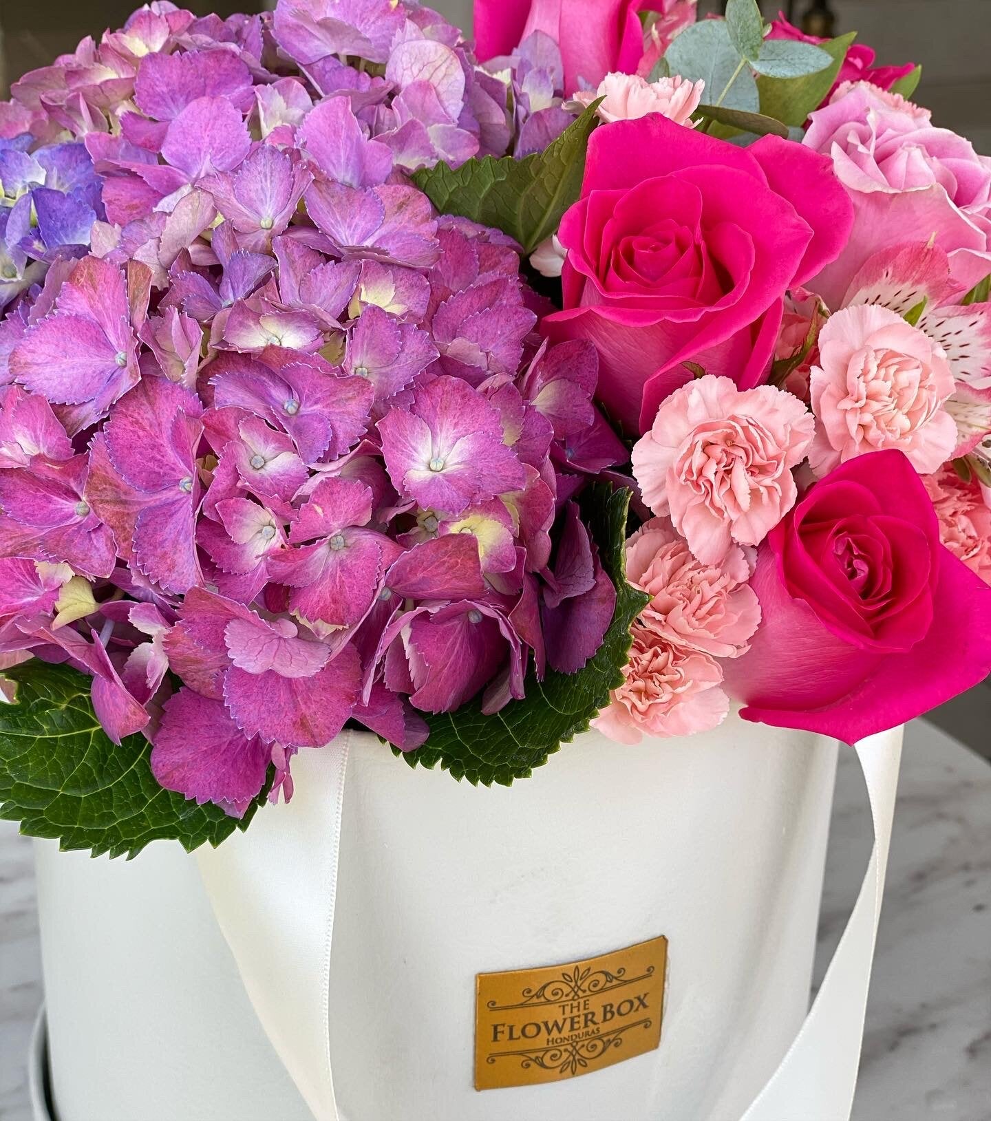 Nuestro arreglo disponible en una sofisticada caja cuero blanco acompañado con hortensias, rosas, y claveles.