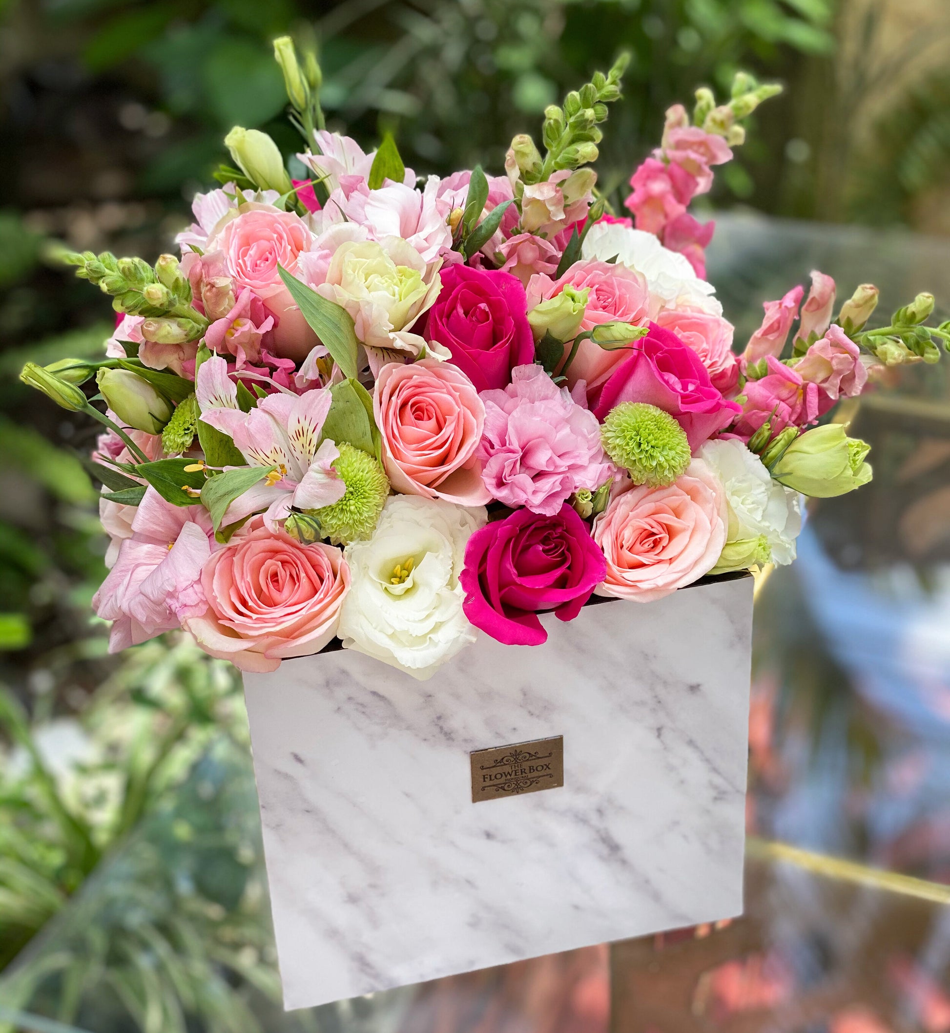El regalo perfecto. Nuestra “Marble Garden Box” está disponible en una caja de mármol blanco en acrílico, lirios y rosas.