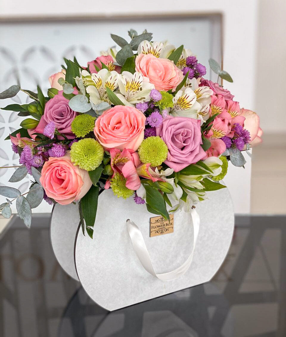 Nuestro arreglo “Marble Purse” disponible en una sofisticada caja de mármol negra, rosas y astromelias.