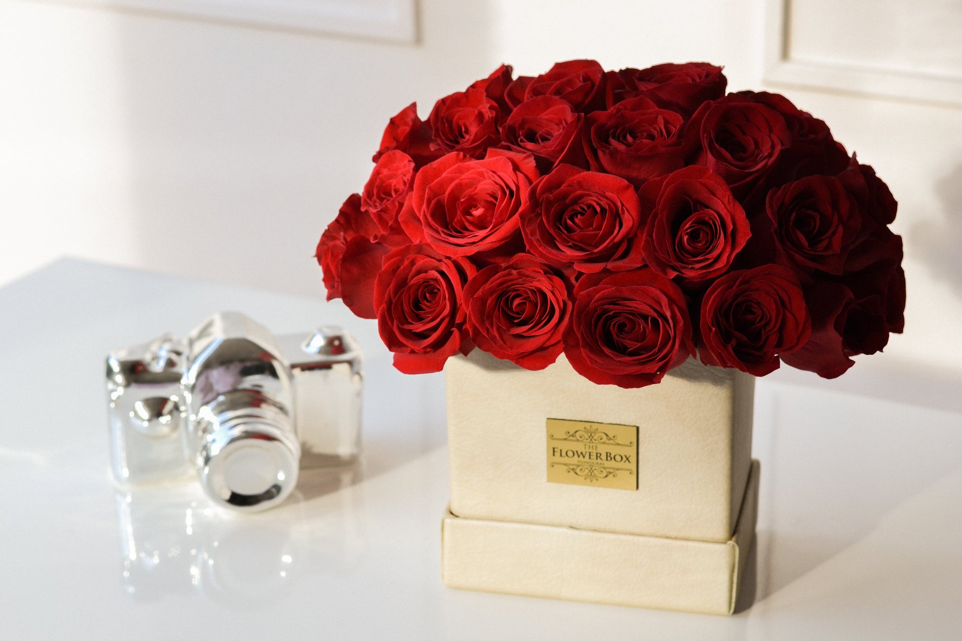 Disponible en una elegante caja, con placa the flower box con el color de rosas rojas.