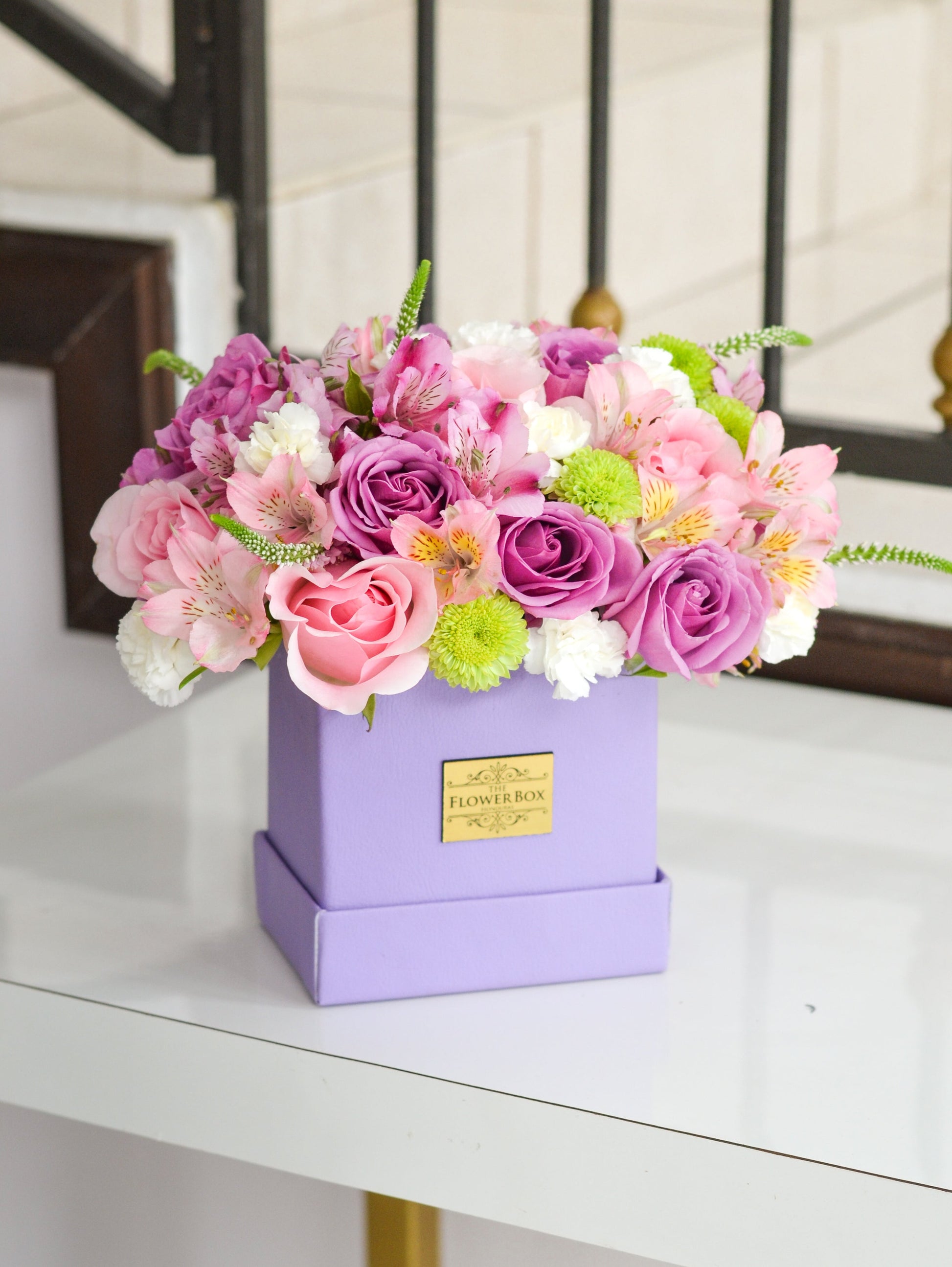 Este arreglo incluye una variedad de rosas cuidadosamente seleccionadas, en tonos morados, rosados y beige, creando una combinación visualmente atractiva y armoniosa.