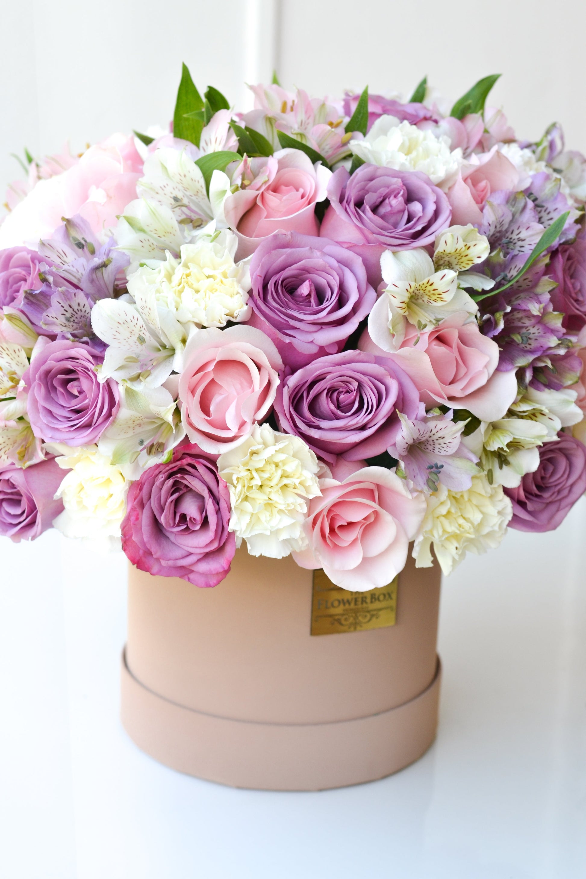 Nuestra caja “Not Your Typical Nude Box” disponible en una sofisticada caja de cuero cafe en combinación con flores primaverales y tonos pasteles.