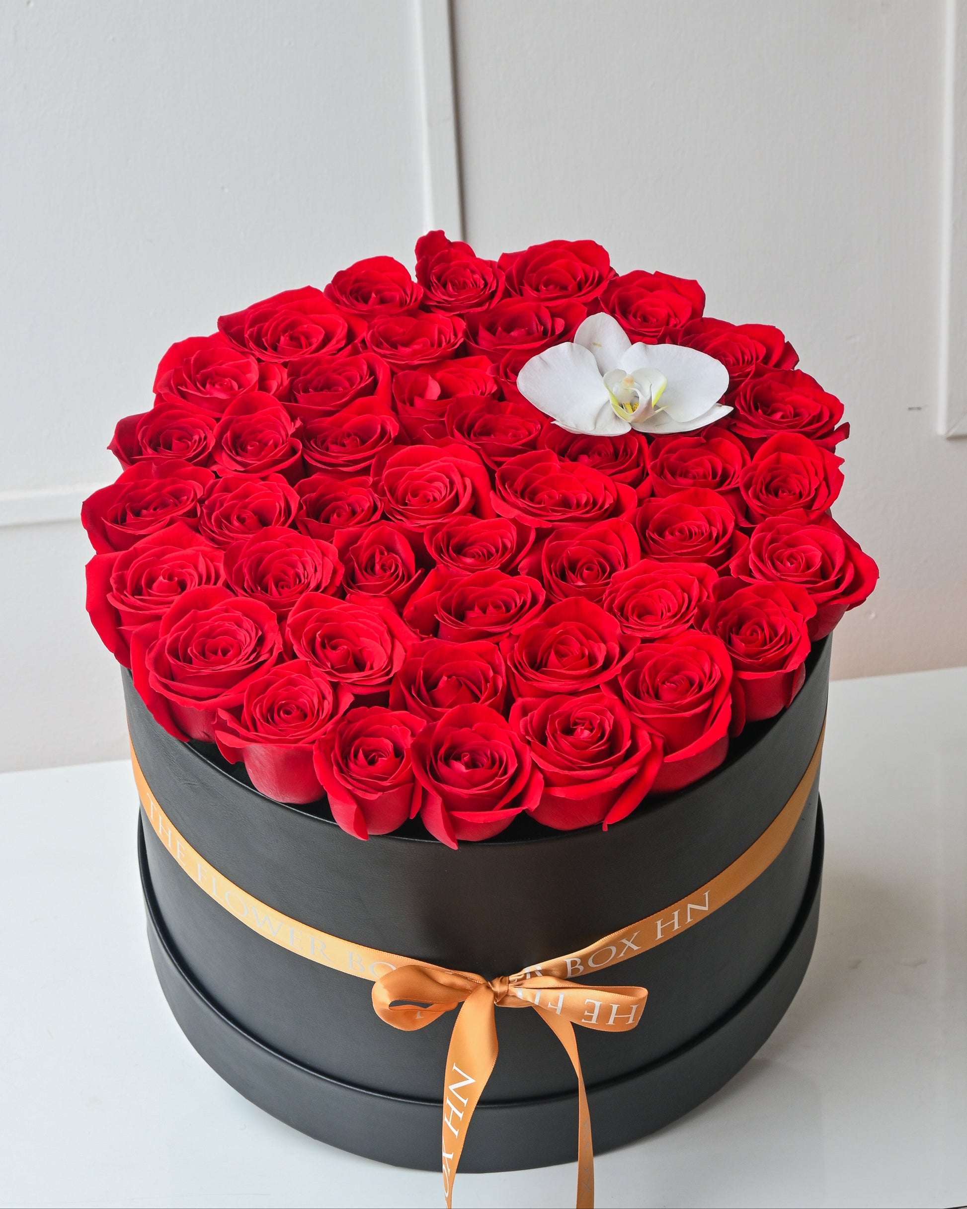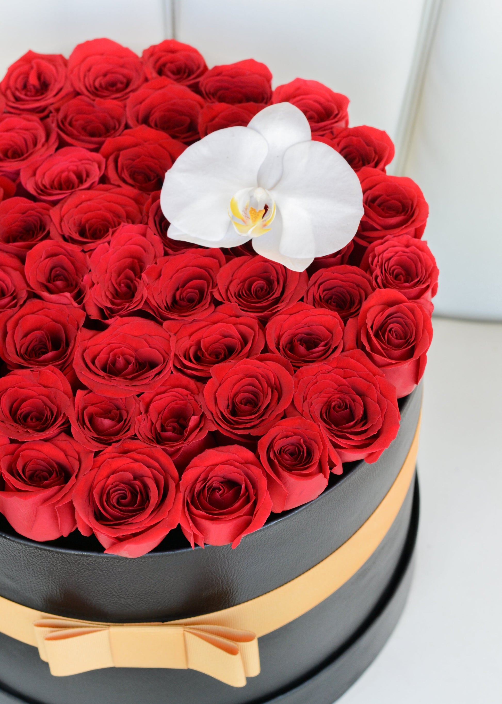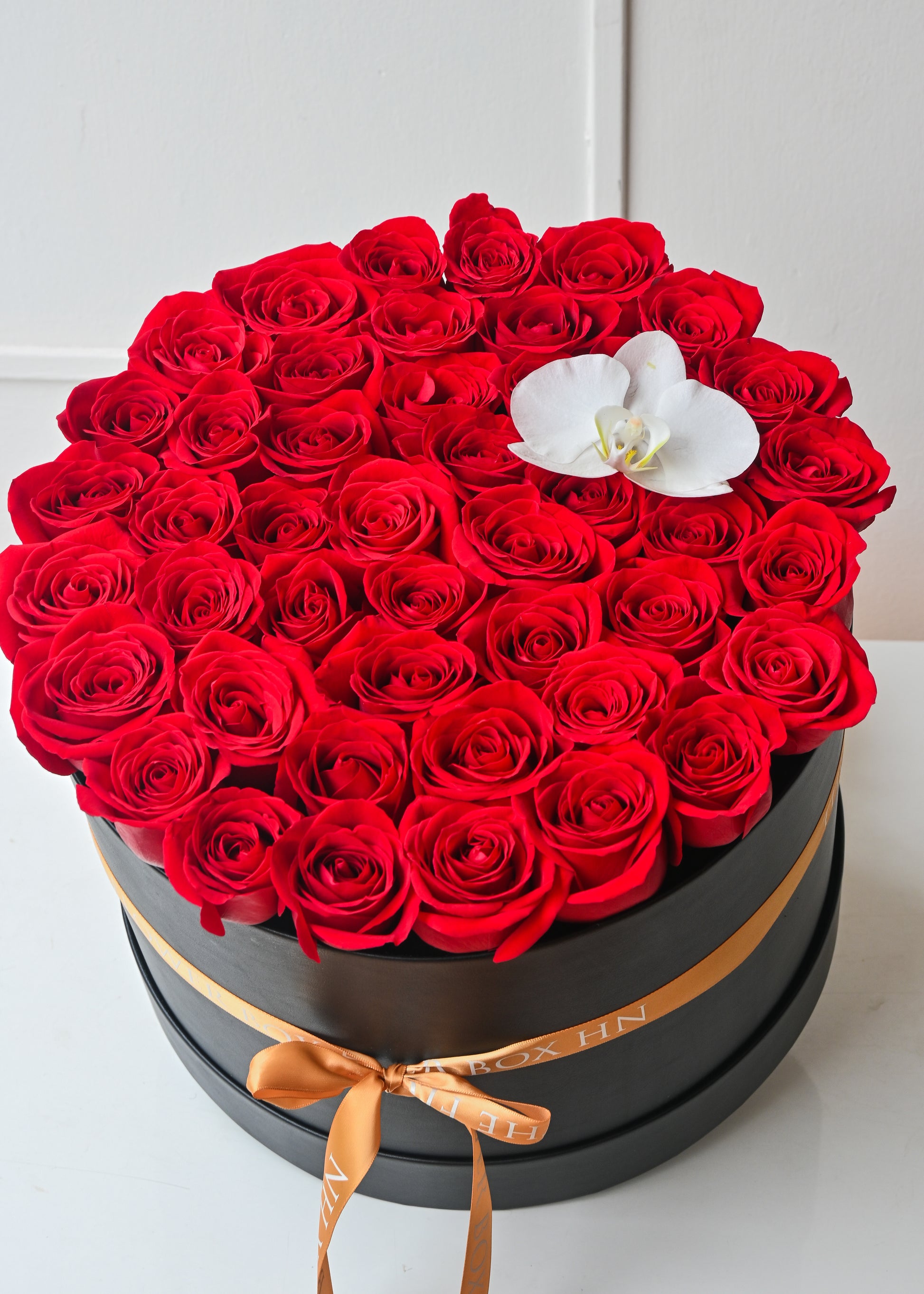 Nuestro arreglo está elaborado en una caja elegante color negro, rosas y una hermosa orquídea blanca.