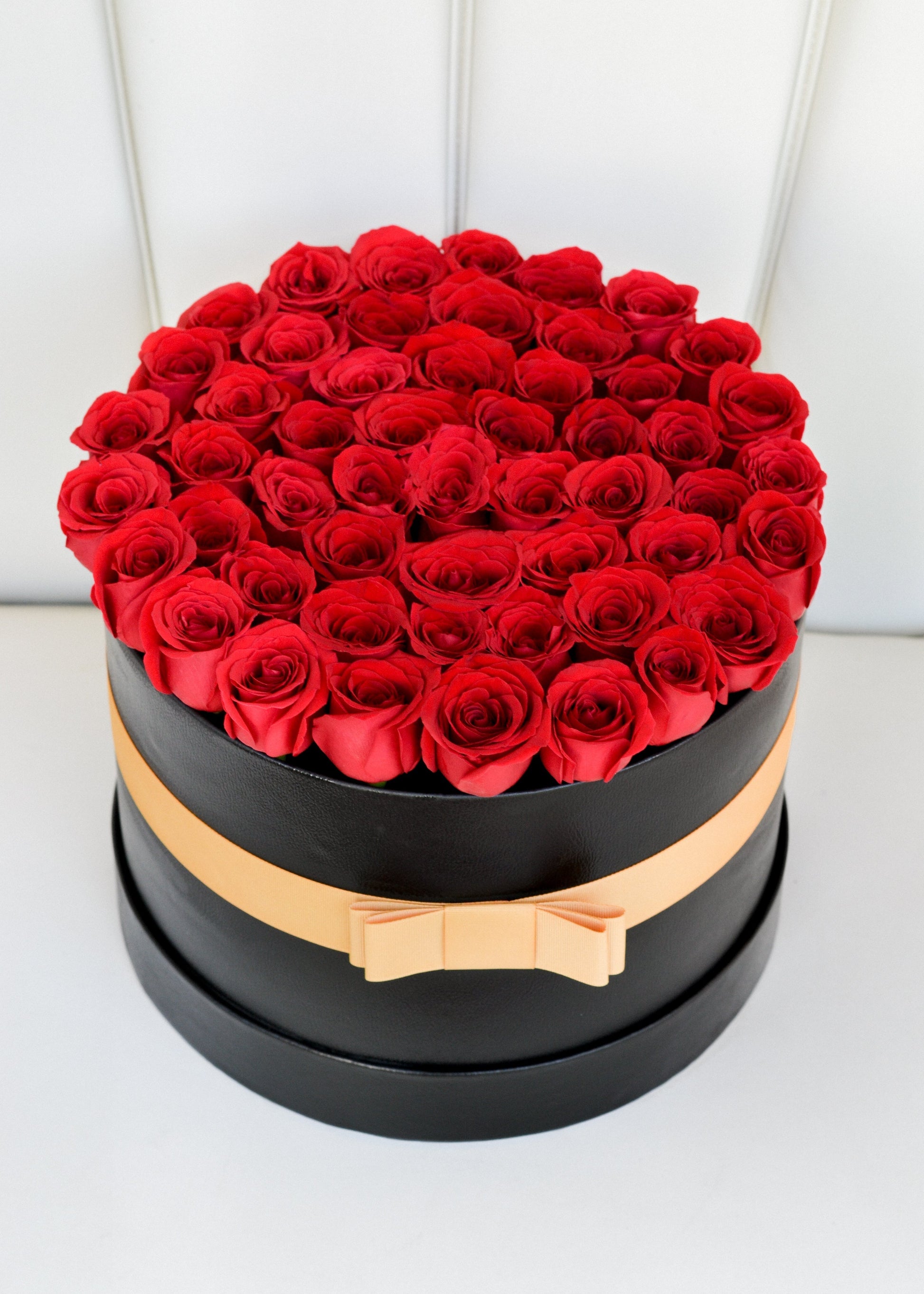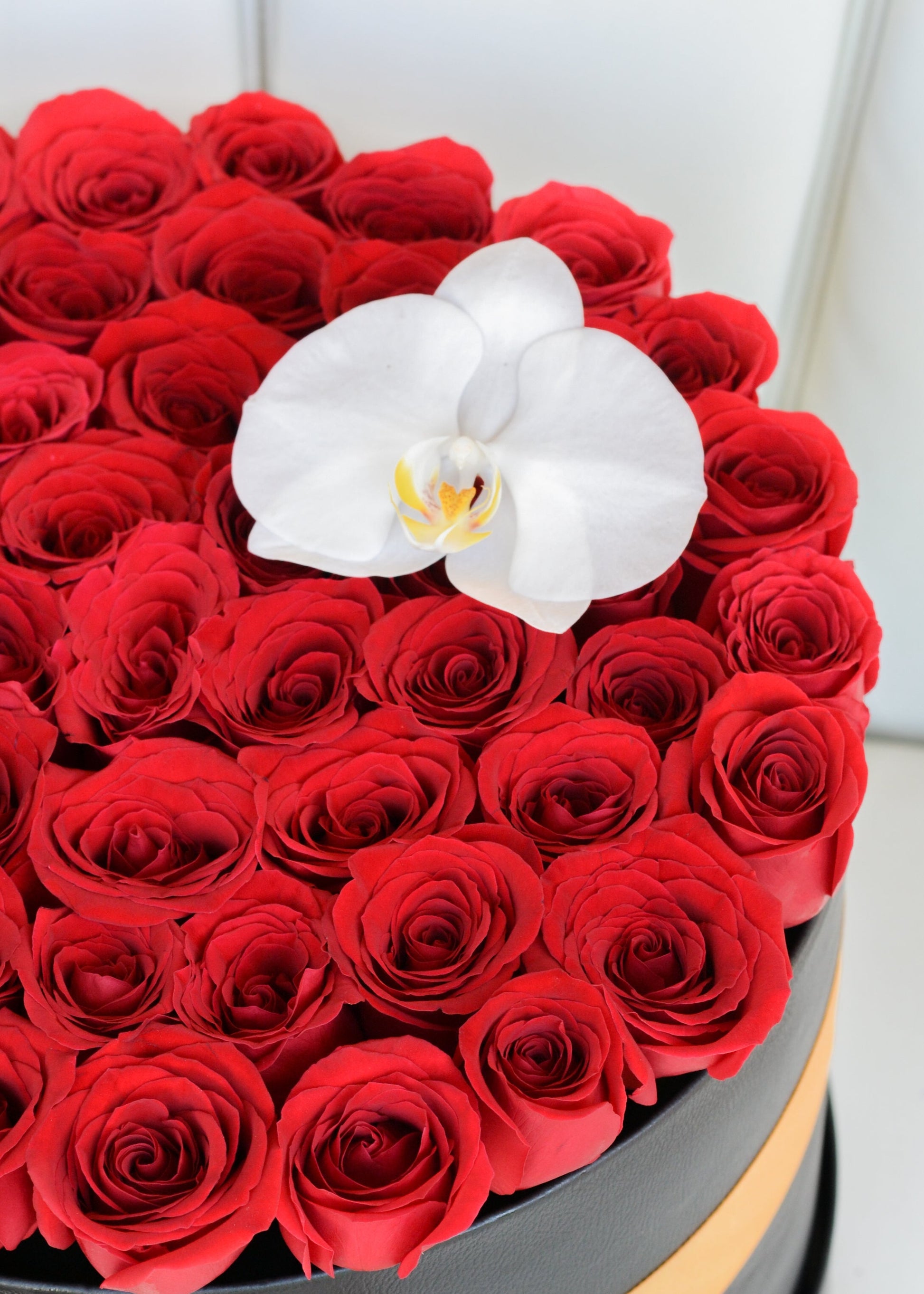 Nuestro arreglo está elaborado en una caja elegante color negro, rosas y una hermosa orquídea blanca.