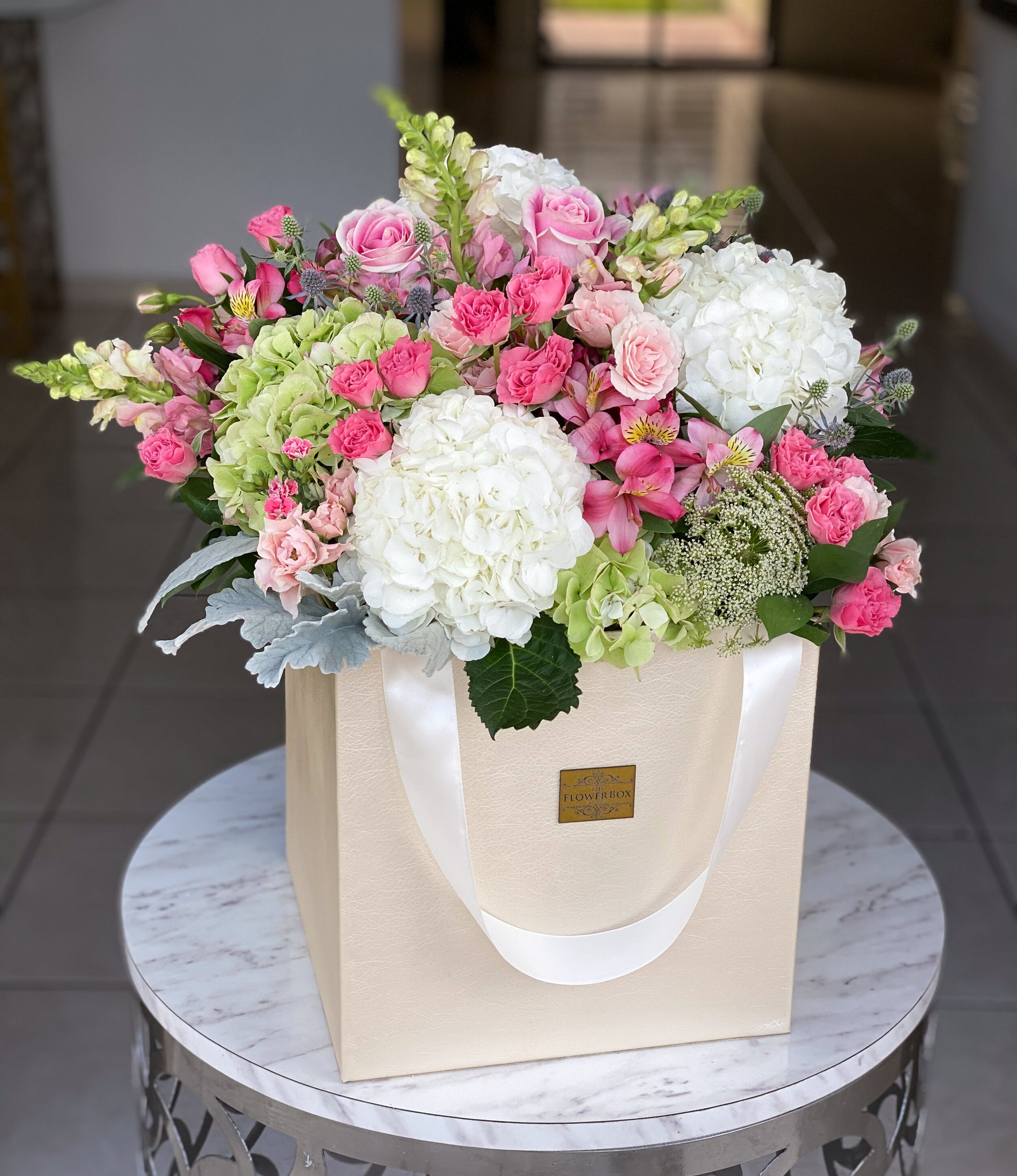 El arreglo perfecto para cualquier ocasión. Elaborado en una caja de gamuza beige con flores frescas.