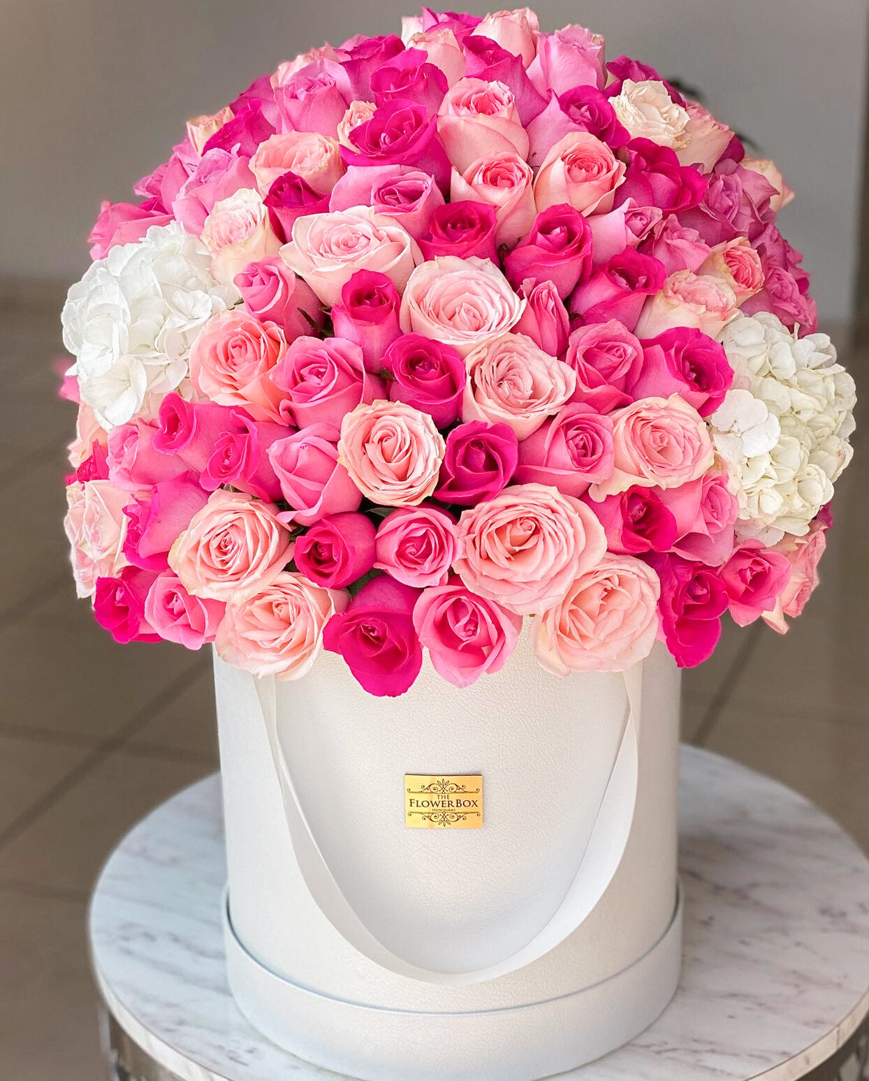 Disponible en una elegante caja de cuero blanco con rosas en tono rosado claro y hortensias.