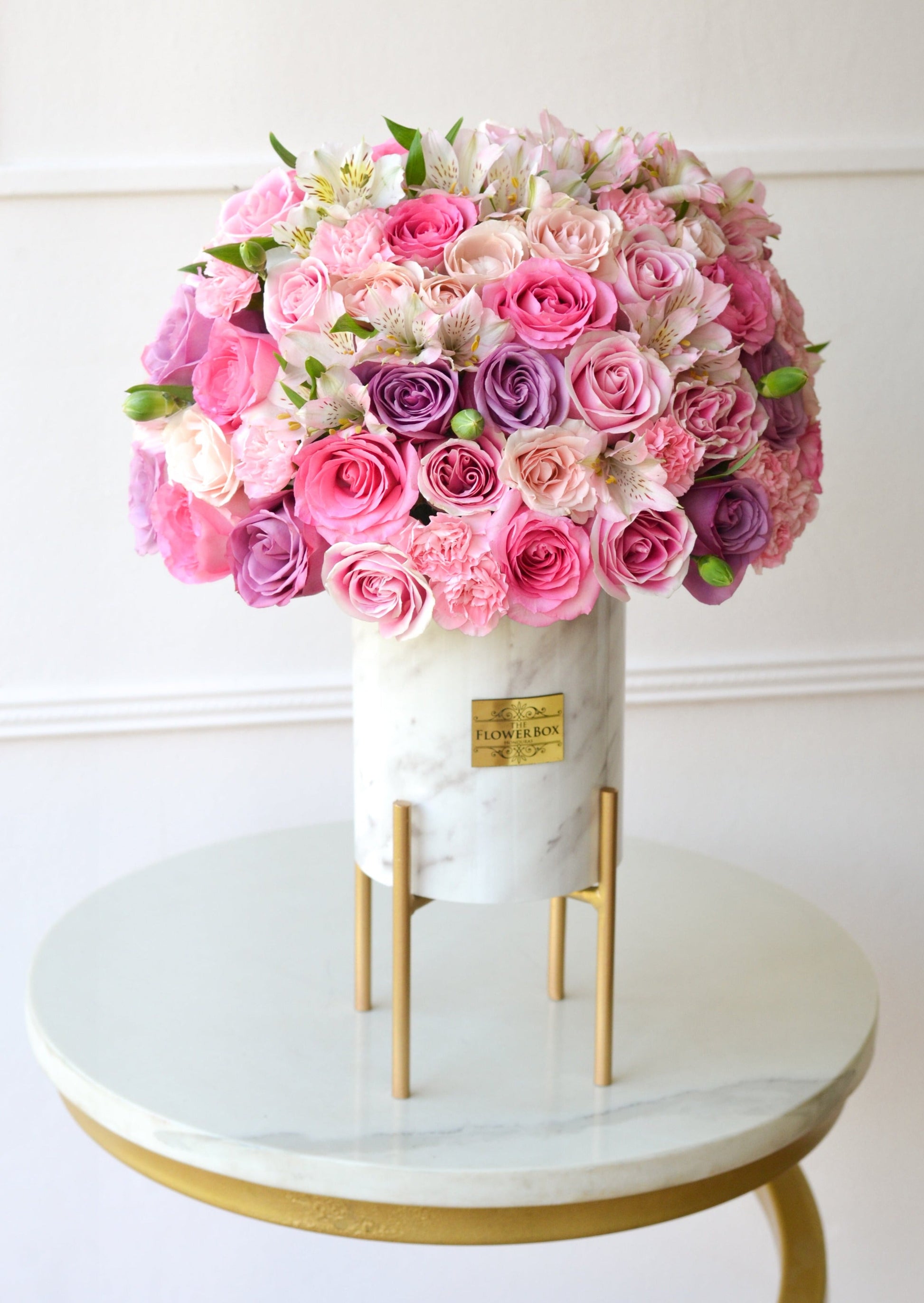 Pink Charmer, un hermoso arreglo floral en tonos rosados, presentado en nuestra icónica base de mármol en acrílico y metal dorado.