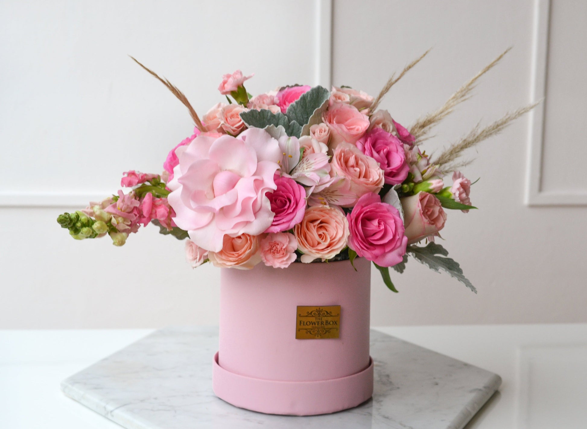 Nuestro Pink Isabella es un arreglo floral encantador en una caja rosada, que incluye una variedad de flores frescas cuidadosamente seleccionadas, como rosas, claveles y otras flores de temporada, creando una combinación visualmente elegante.