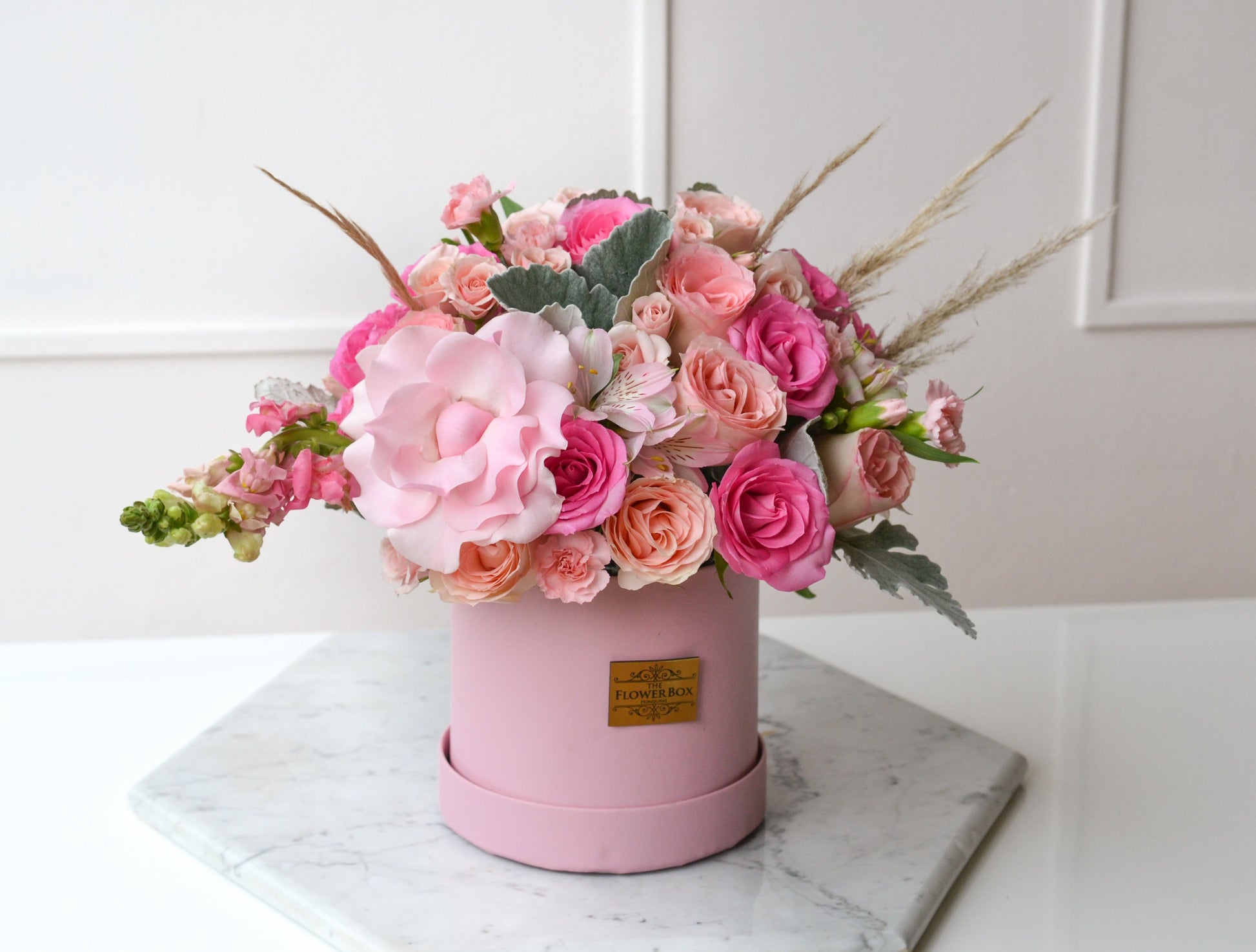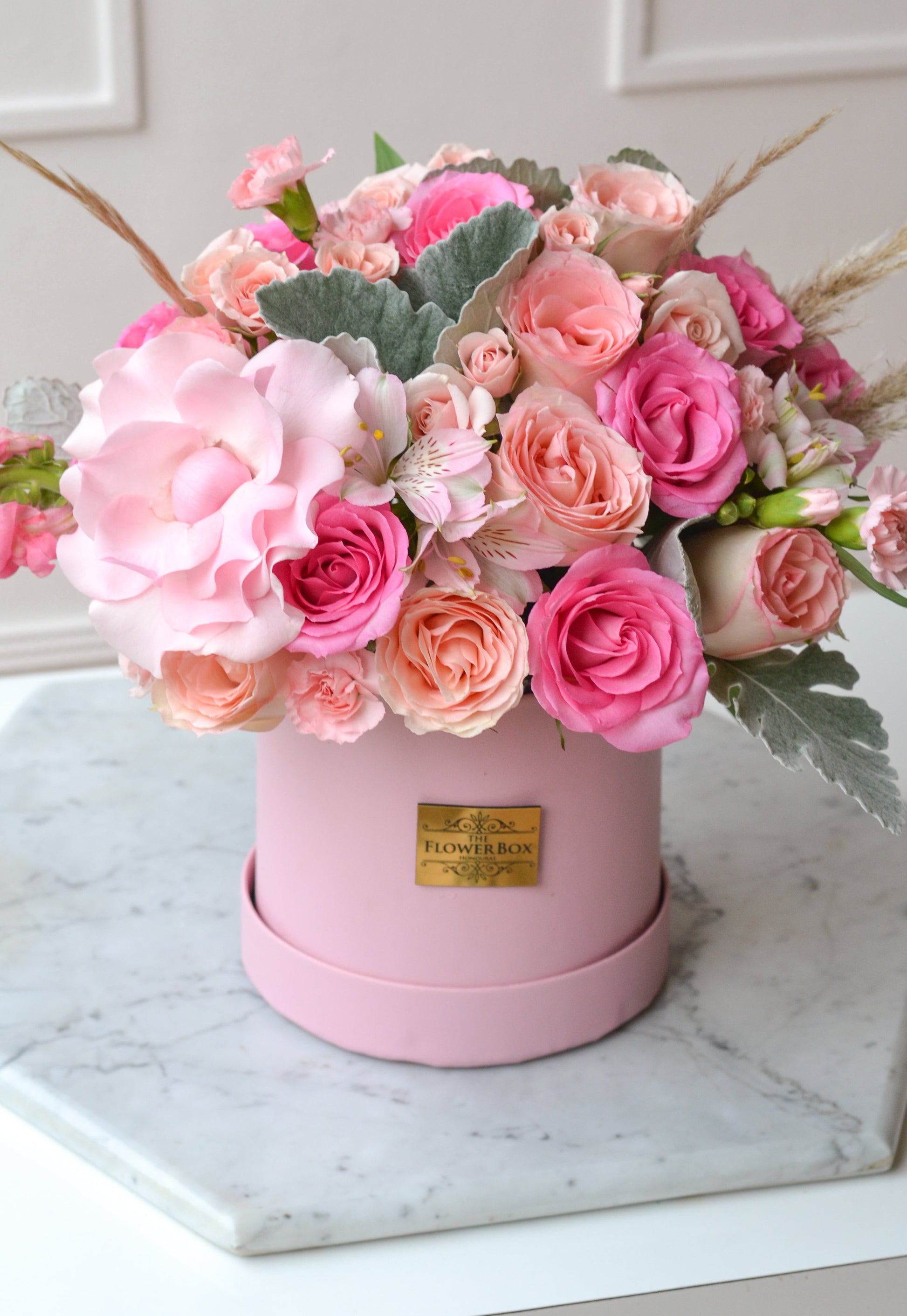 Nuestro Pink Isabella es un arreglo floral encantador en una caja rosada, que incluye una variedad de flores frescas cuidadosamente seleccionadas, como rosas, claveles y otras flores de temporada, creando una combinación visualmente impresionante.