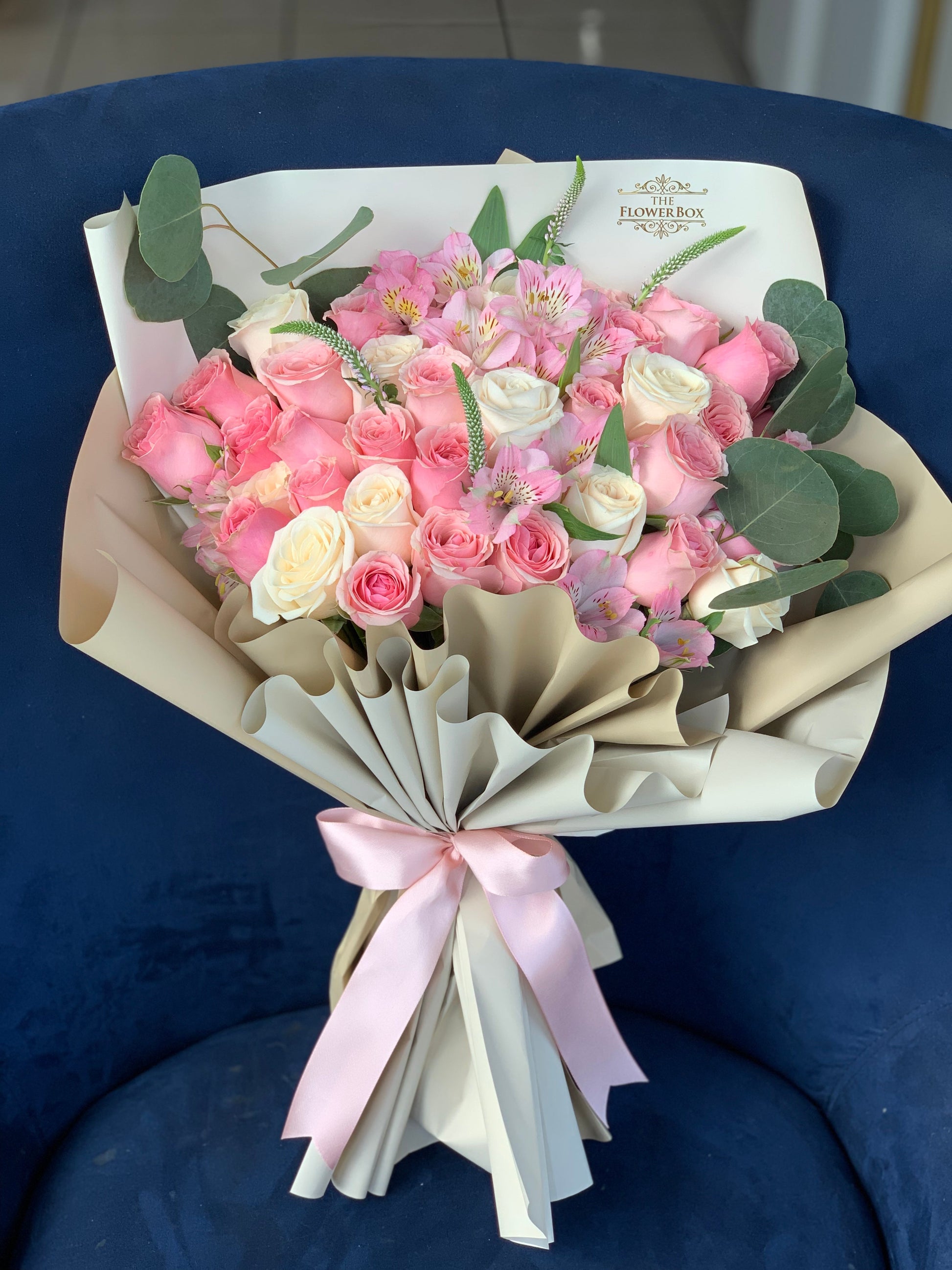 Nuestro elegante y hermoso bouquet viene acompañado de rosas.