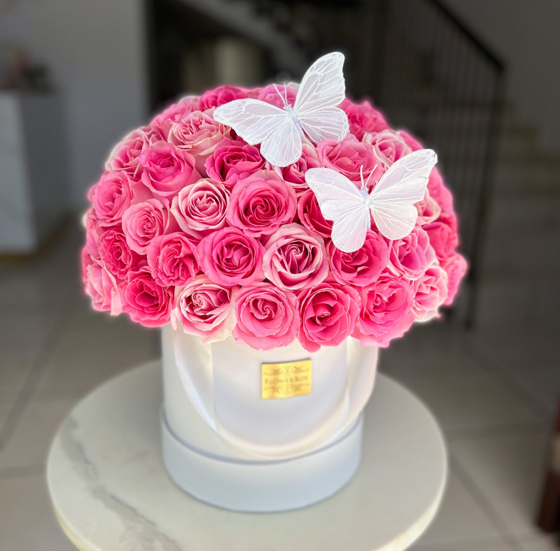 Nuestro arreglo “Pink Monarch” disponible en una sofisticada caja de cuero blanco con un detalle especial en forma de mariposa