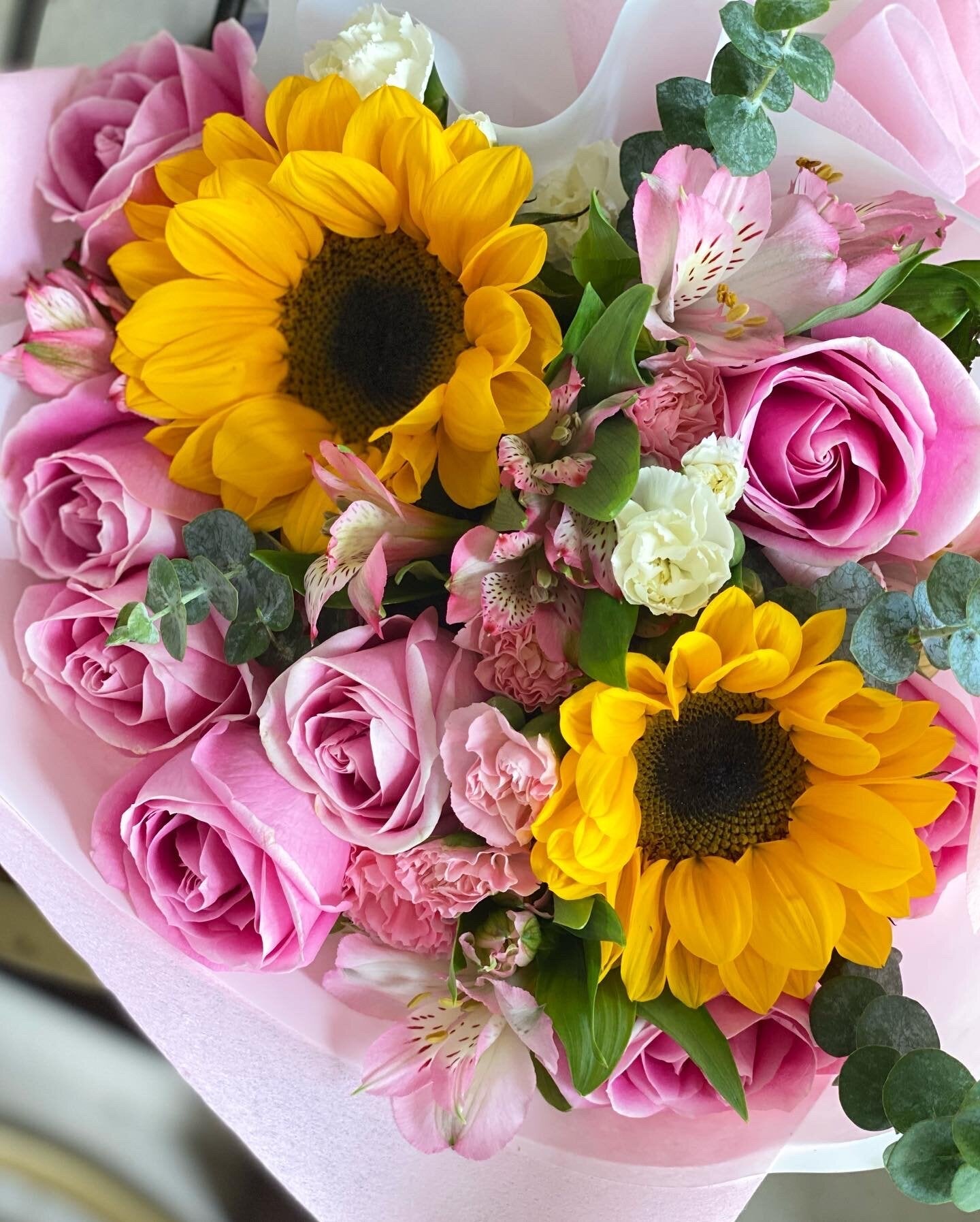 Nuestro Pink Sunshine Bouquet hecho para esas personas que quieren regalar algo espontáneo a esa persona especial. Diseñado con girasoles y rosas.