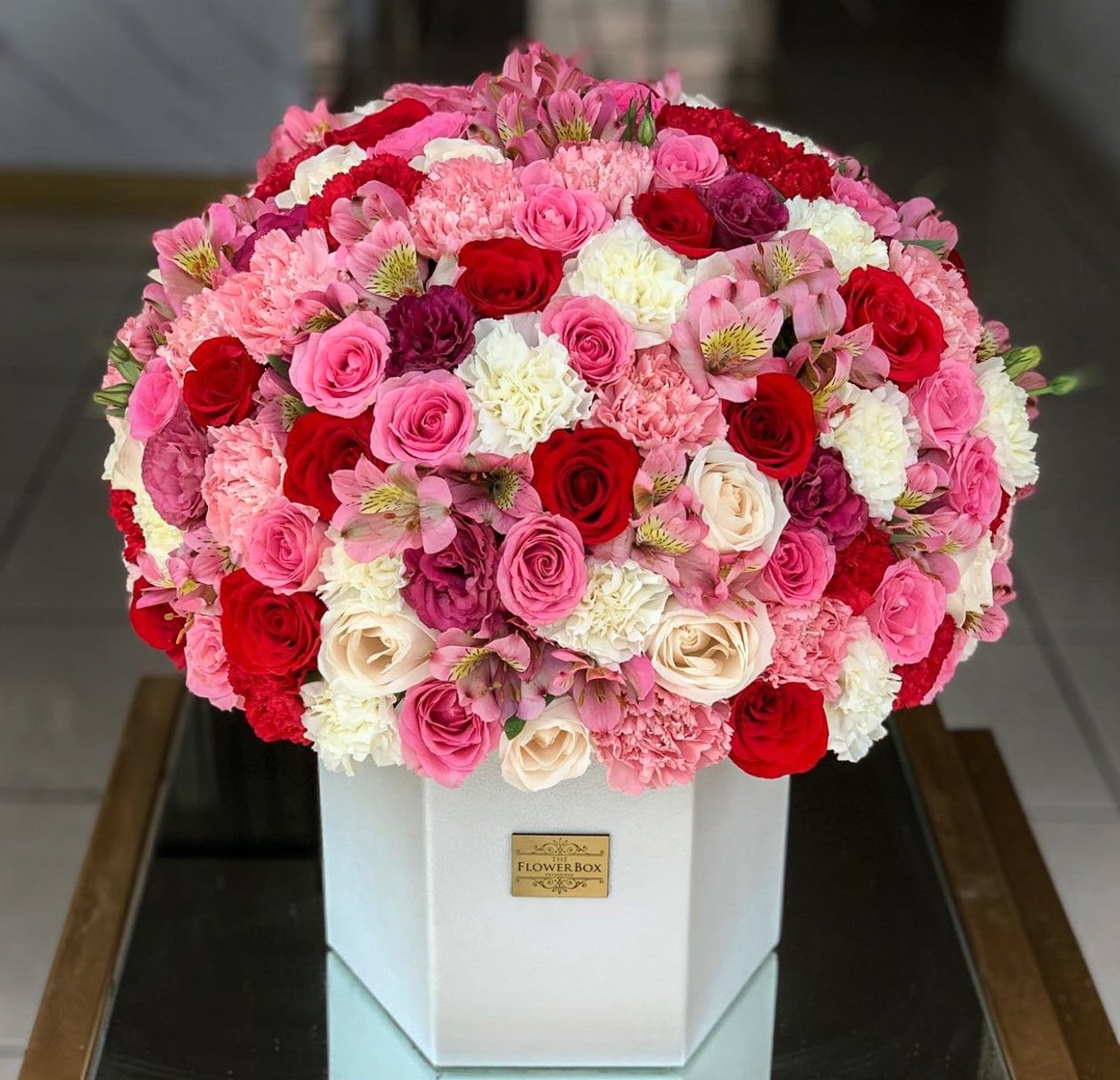 Nuestra caja “Red Berries” disponible en una sofisticada caja de cuero blanco con flores mixtas y frescas.