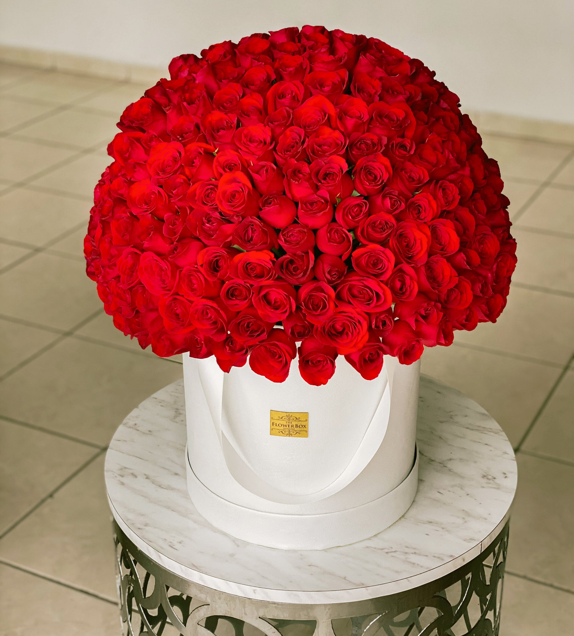 Disponible en una elegante caja de cuero blanco con rosas rojas.