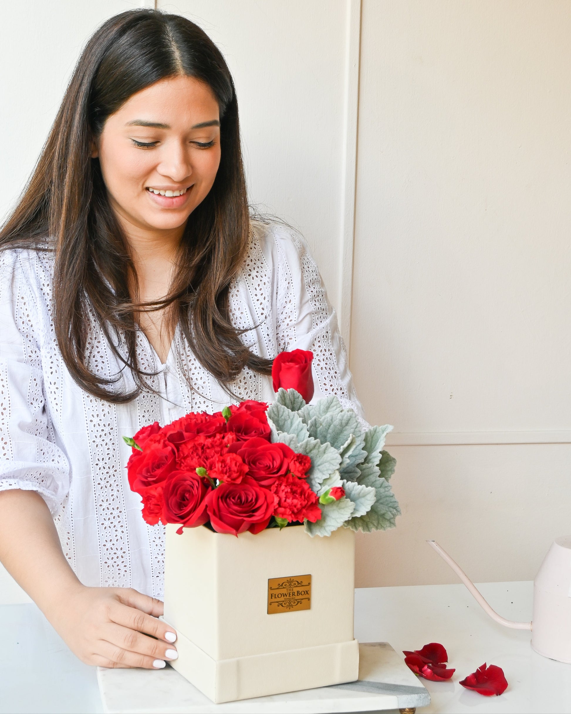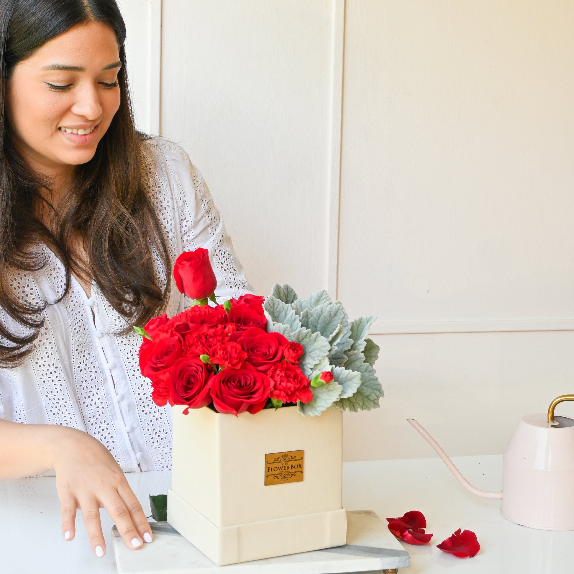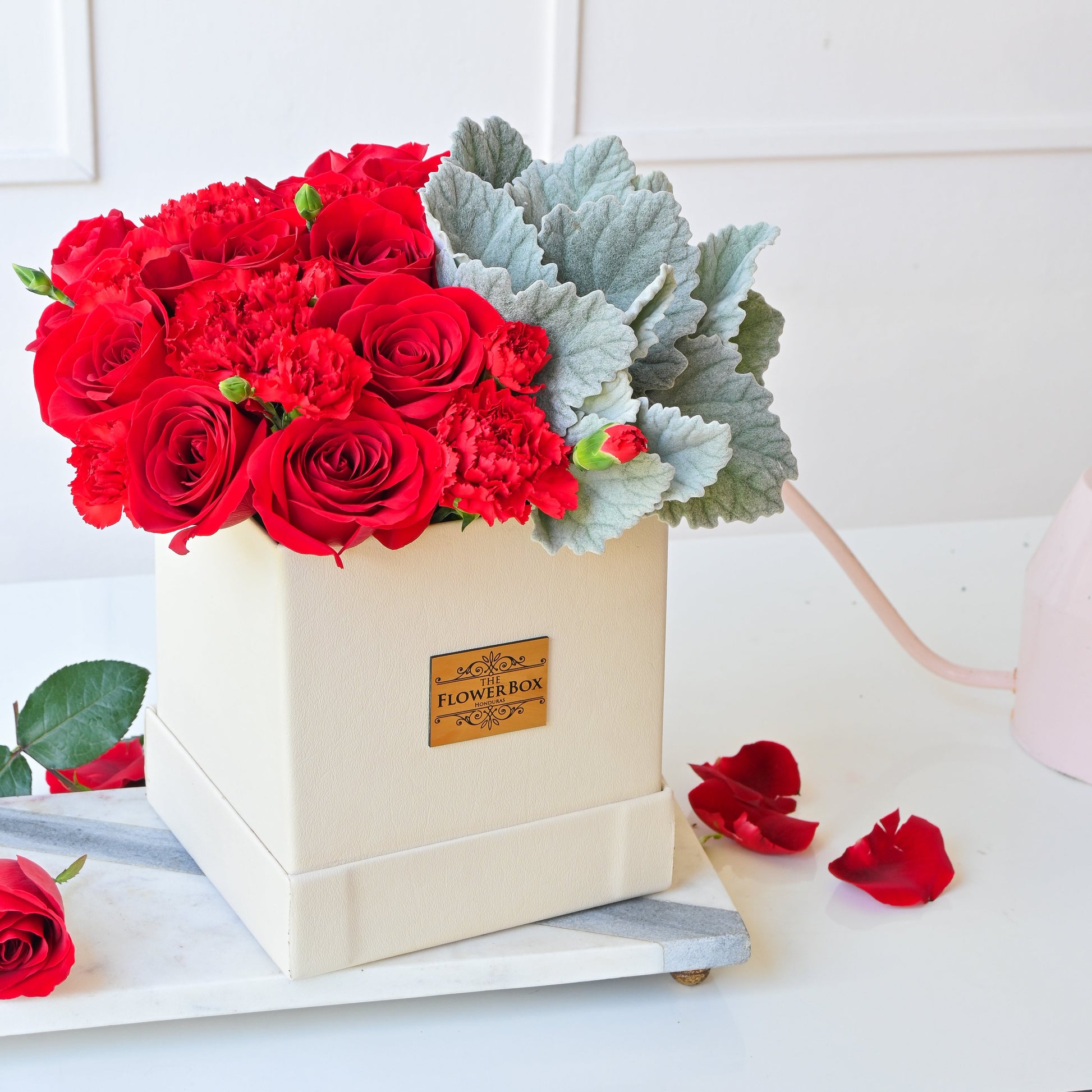 • Rosas rojas premium, símbolo eterno de amor y pasión, complementadas con follaje tipo velvet que añade textura y sofisticación.