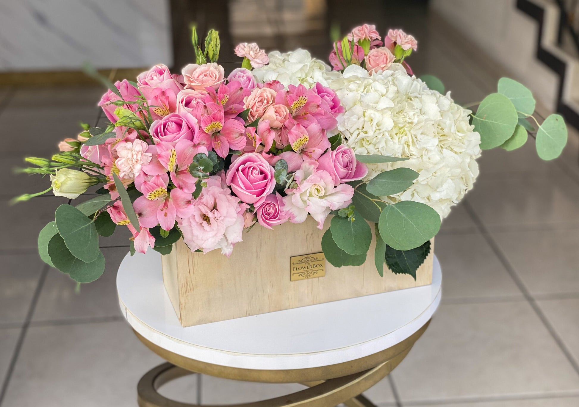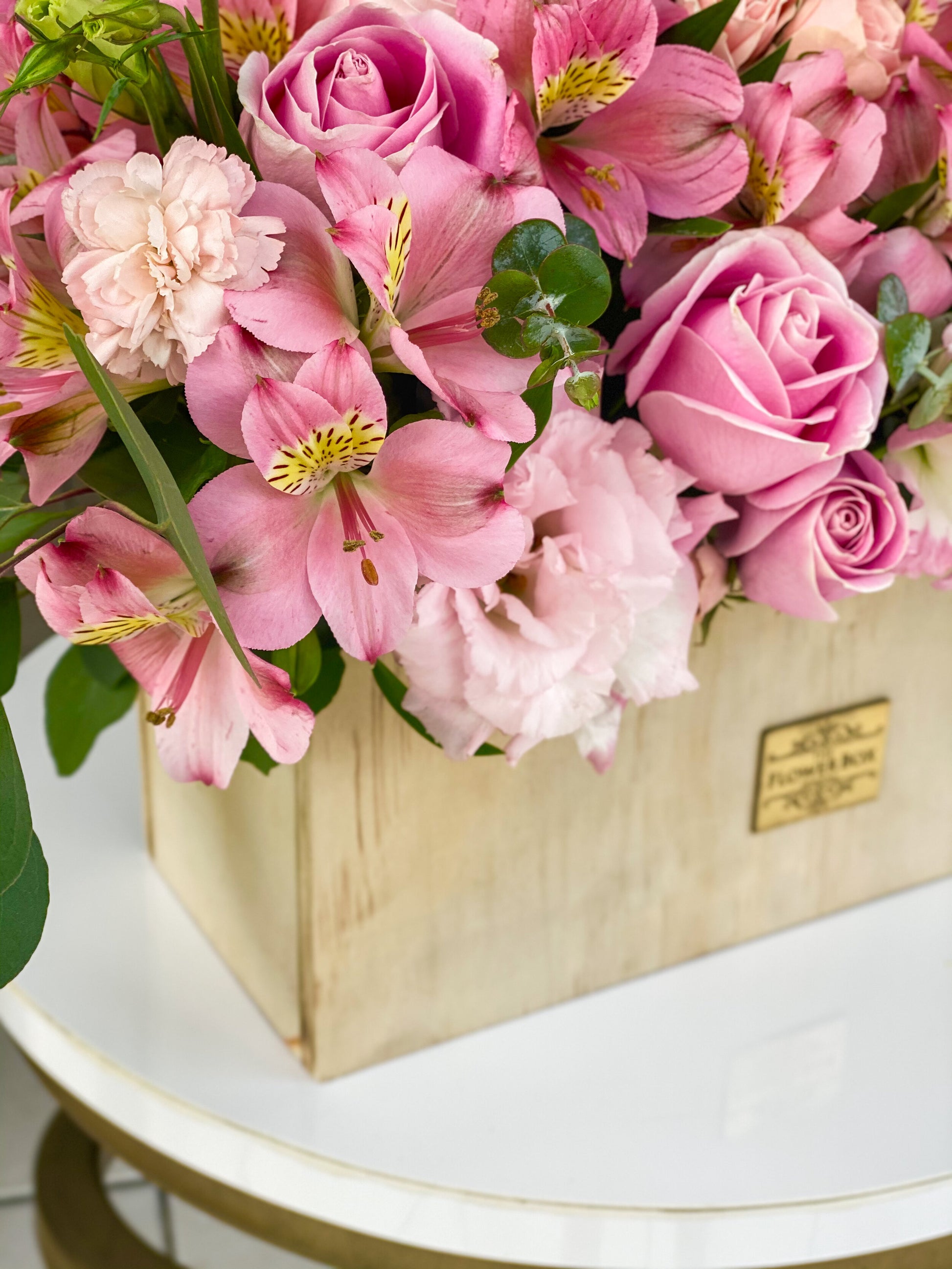 Nuestra nueva caja Rosewood es perfecta para cualquier ocasión. Elaborado con flores frescas en tonos rosado en una caja de madera con nuestro logo icónico.