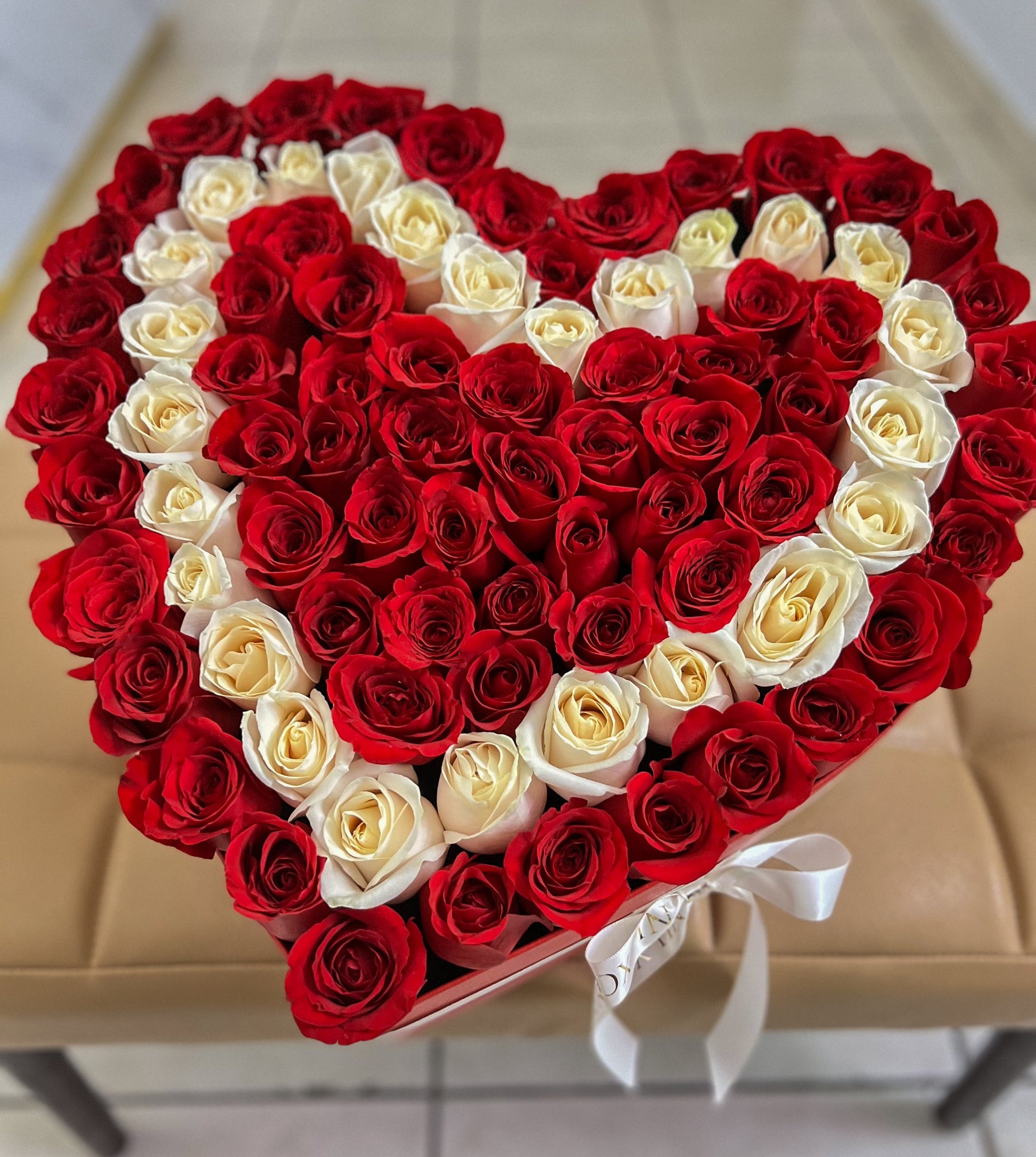 Nuestro nuevo corazón en una caja roja con rosas blancas y rojas