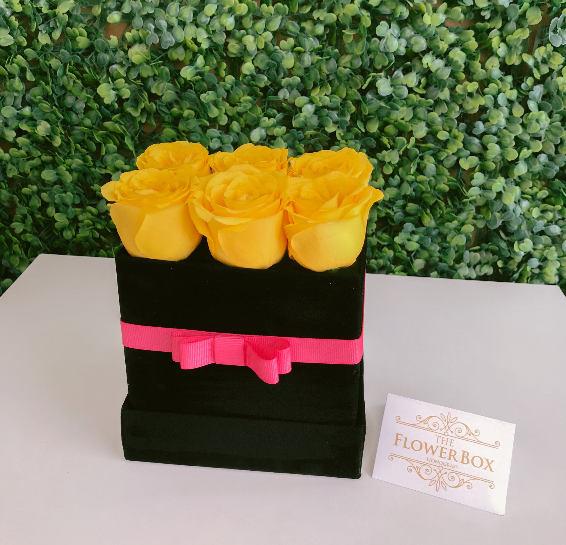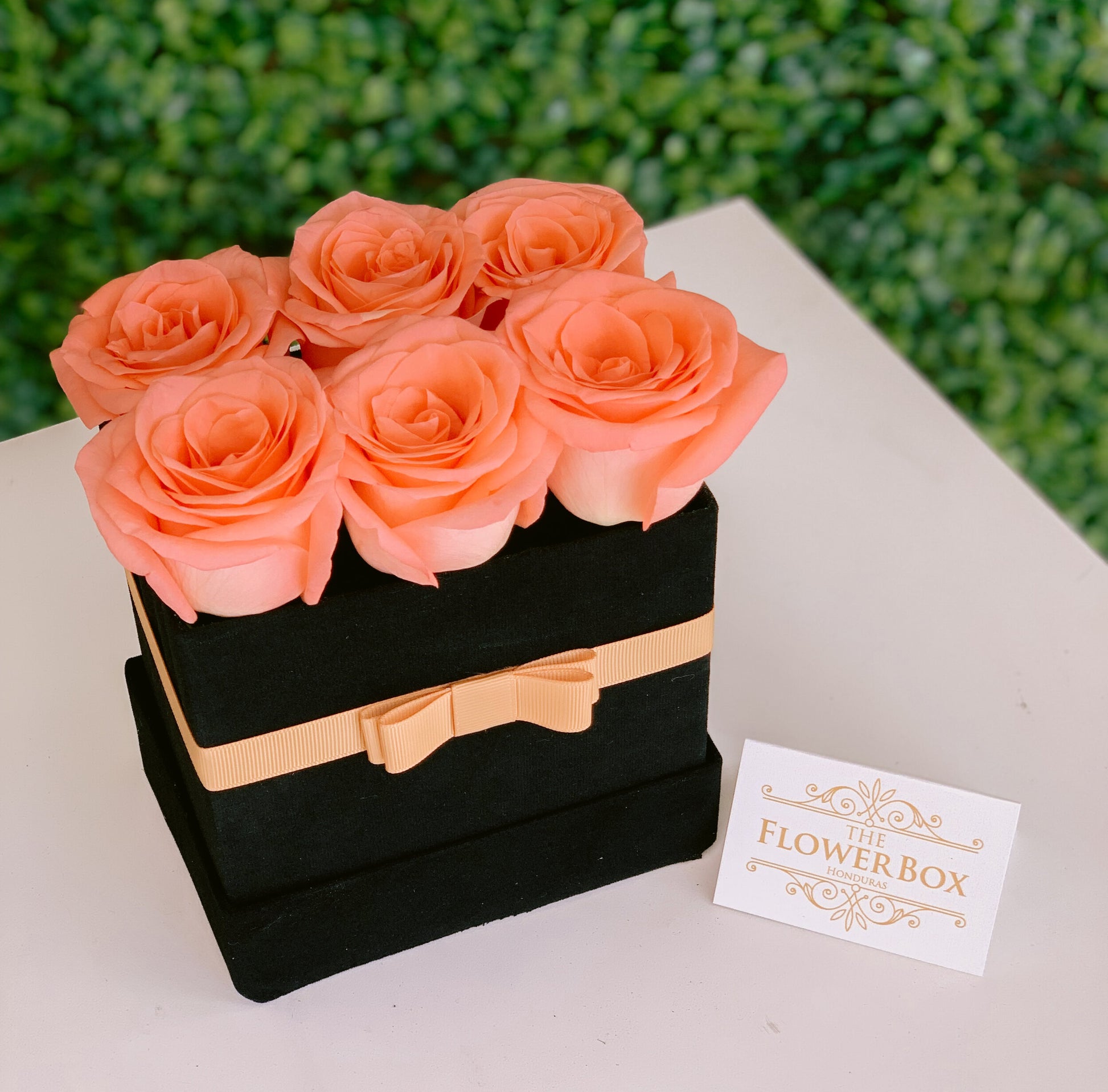Nuestro arreglo disponible en una sofisticada caja gamuza o cuero beige acompañado con 6 rosas frescas.