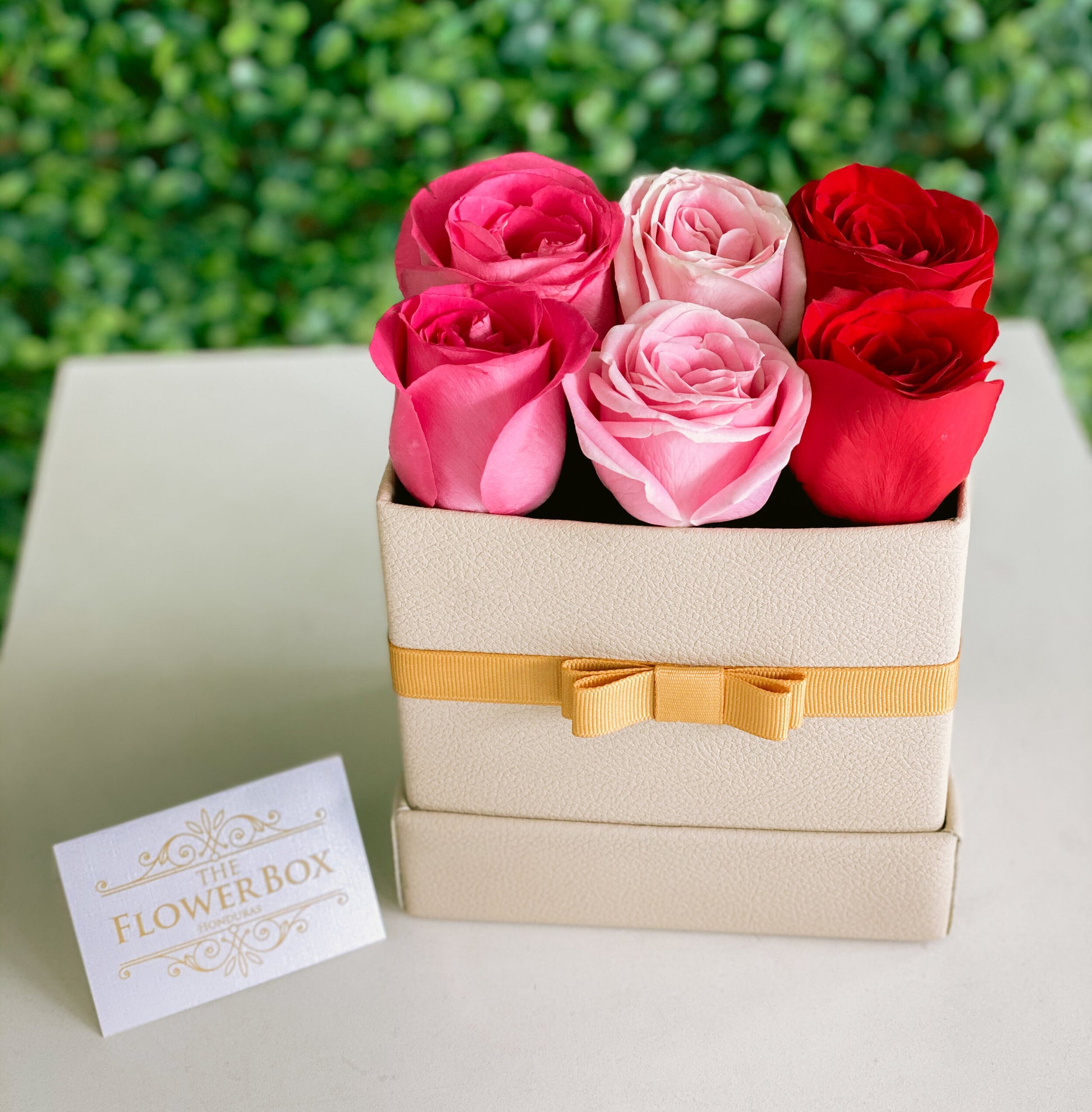 Nuestro arreglo disponible en una sofisticada caja gamuza o cuero beige acompañado con 6 rosas frescas.