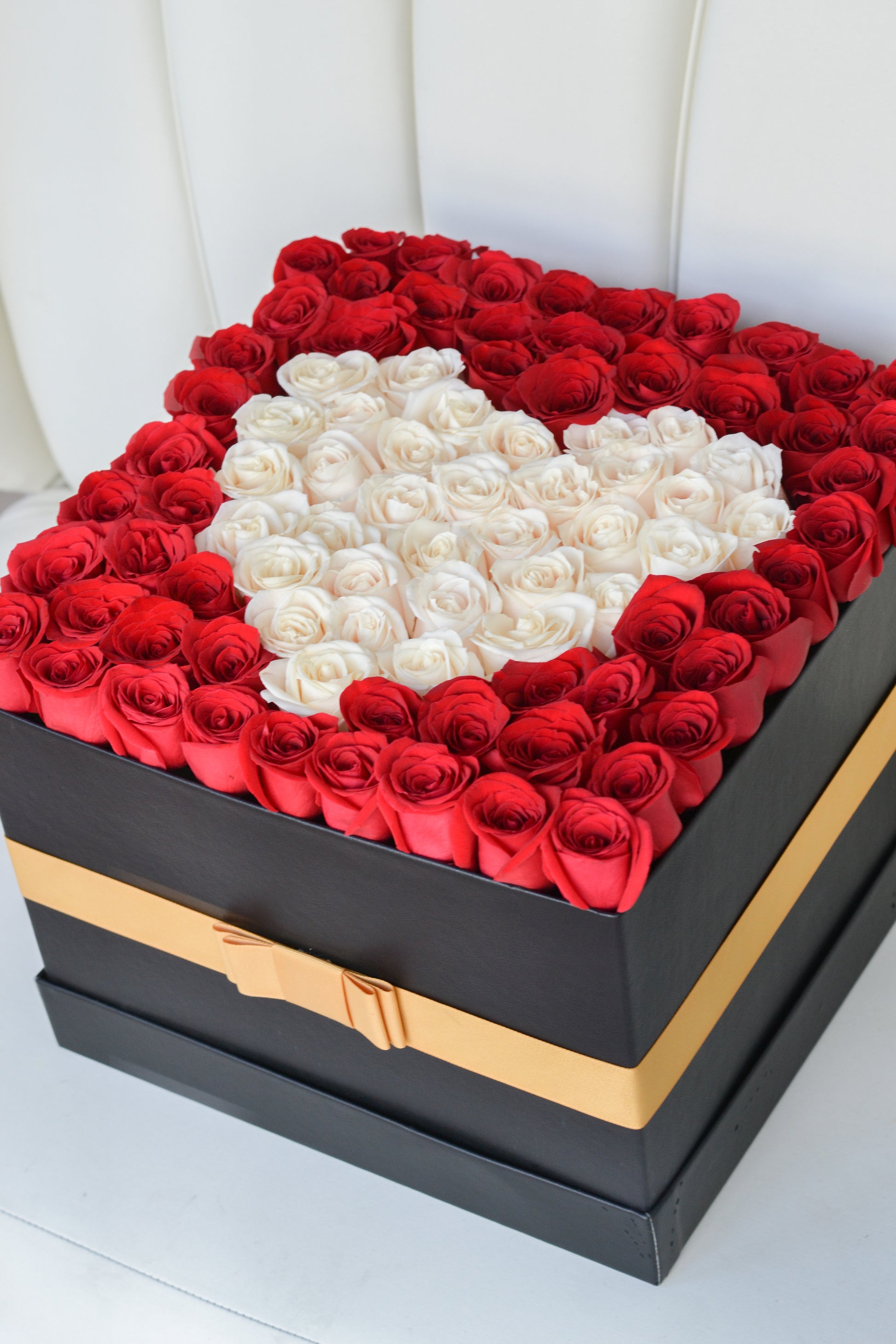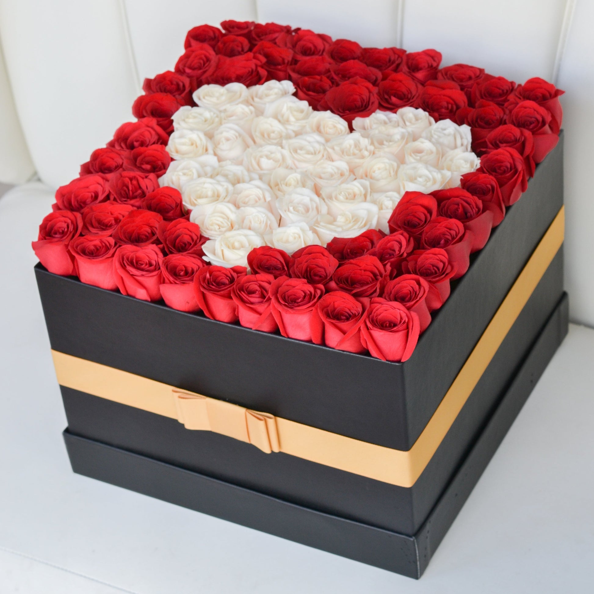 Nuestro arreglo disponible en una sofisticada caja cuerina negra con rosas rojas y blancas.
