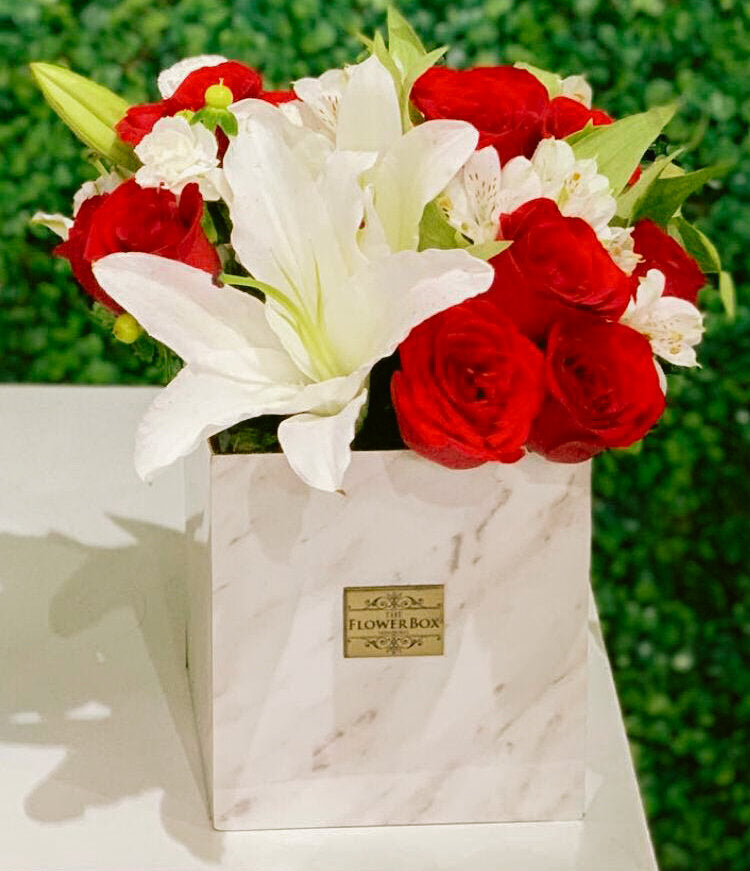 ¡Detalles que enamoran a cualquiera! Nuestra “Square Marble Box” está disponible en una caja de mármol blanco en acrílico, lirios y rosas. Perfecto para San Valentín