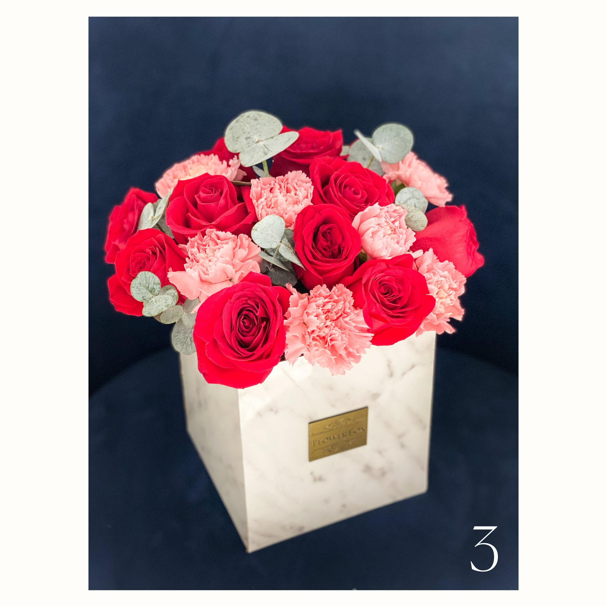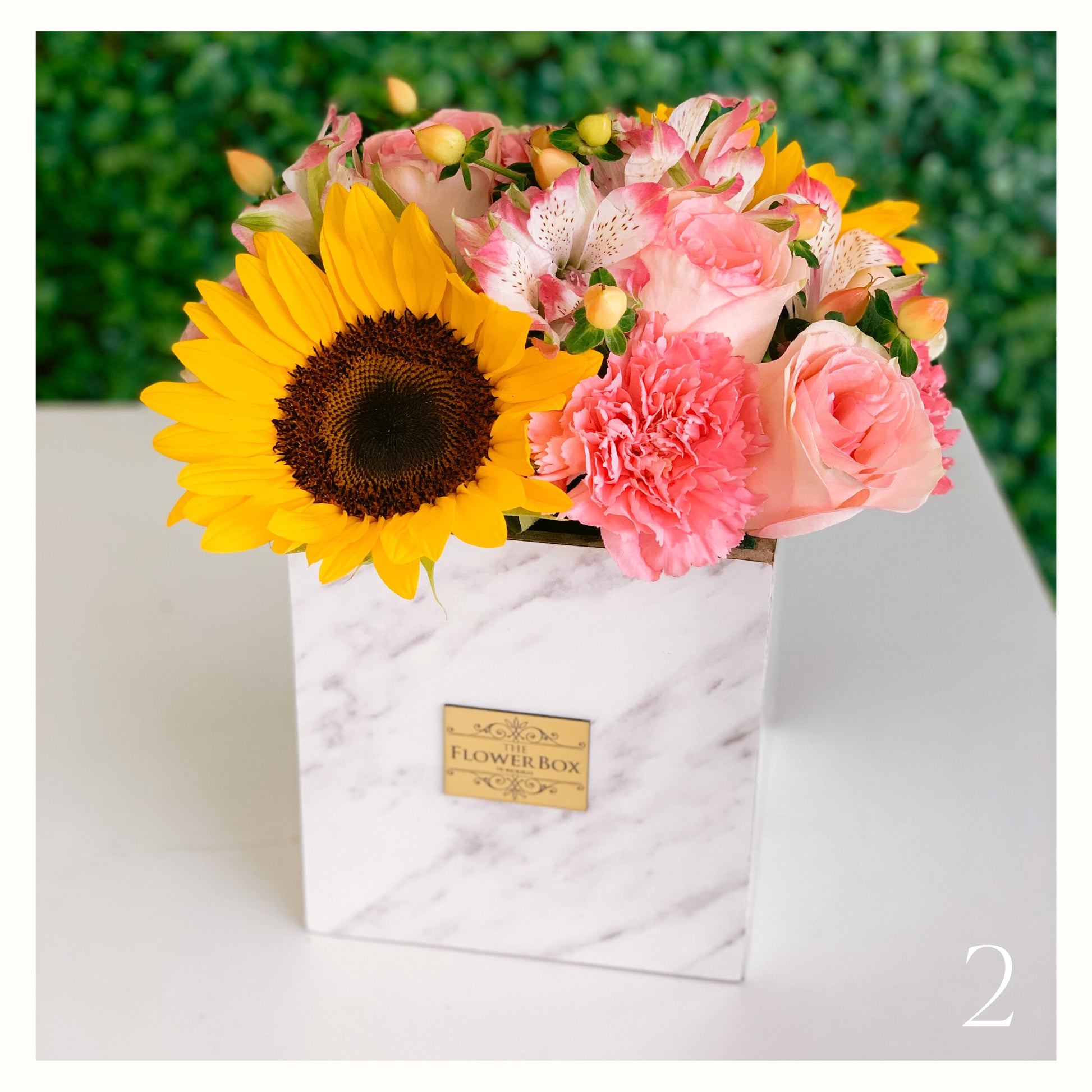 Nuestro arreglo disponible en una sofisticada caja de mármol blanco con flores mixtas y frescas.