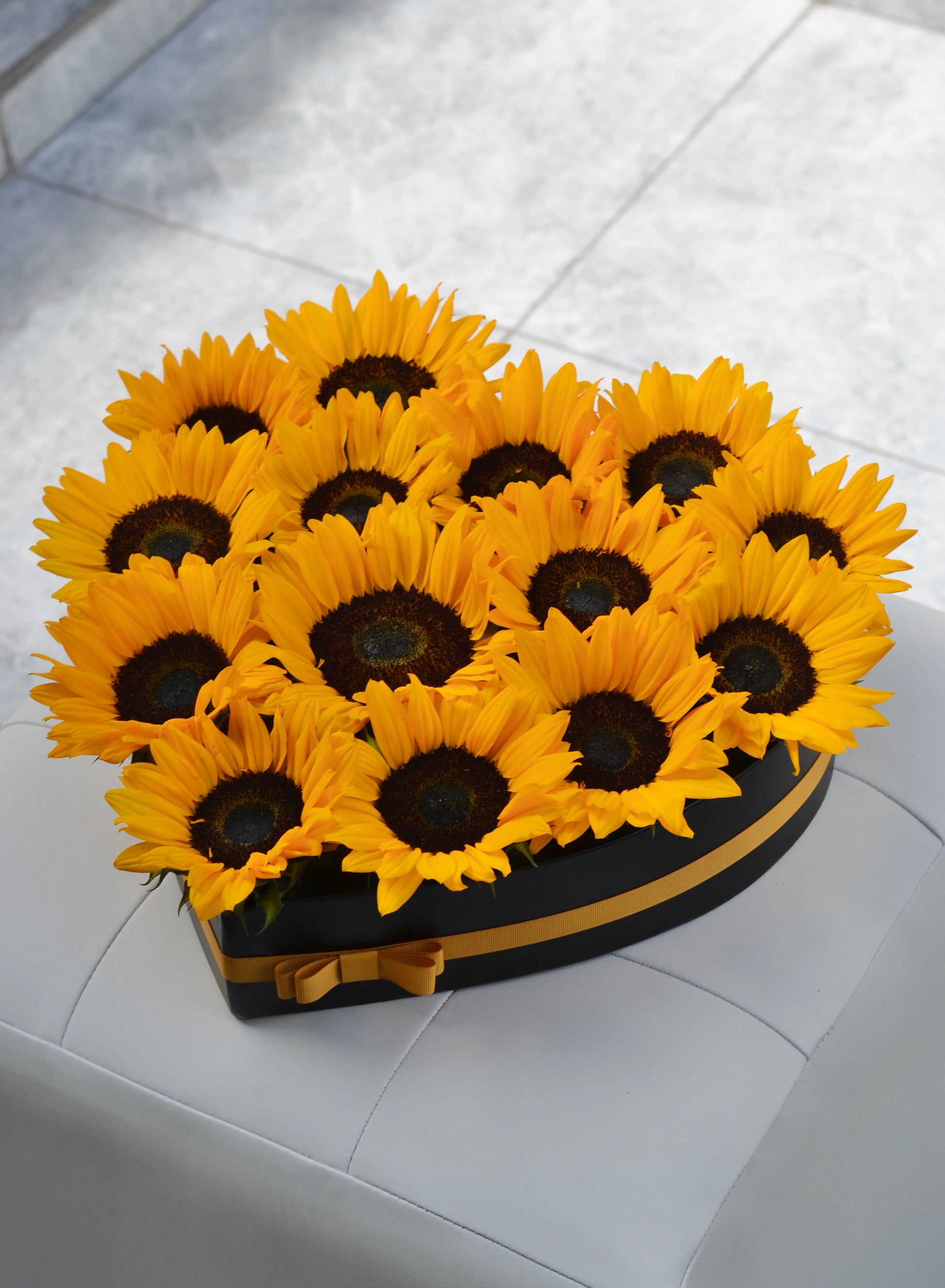 Nuestro hermoso corazón de girasoles en una delicada caja de cuerina negra y cinta dorada. Ideal para la tu persona especial que ama los girasoles.
