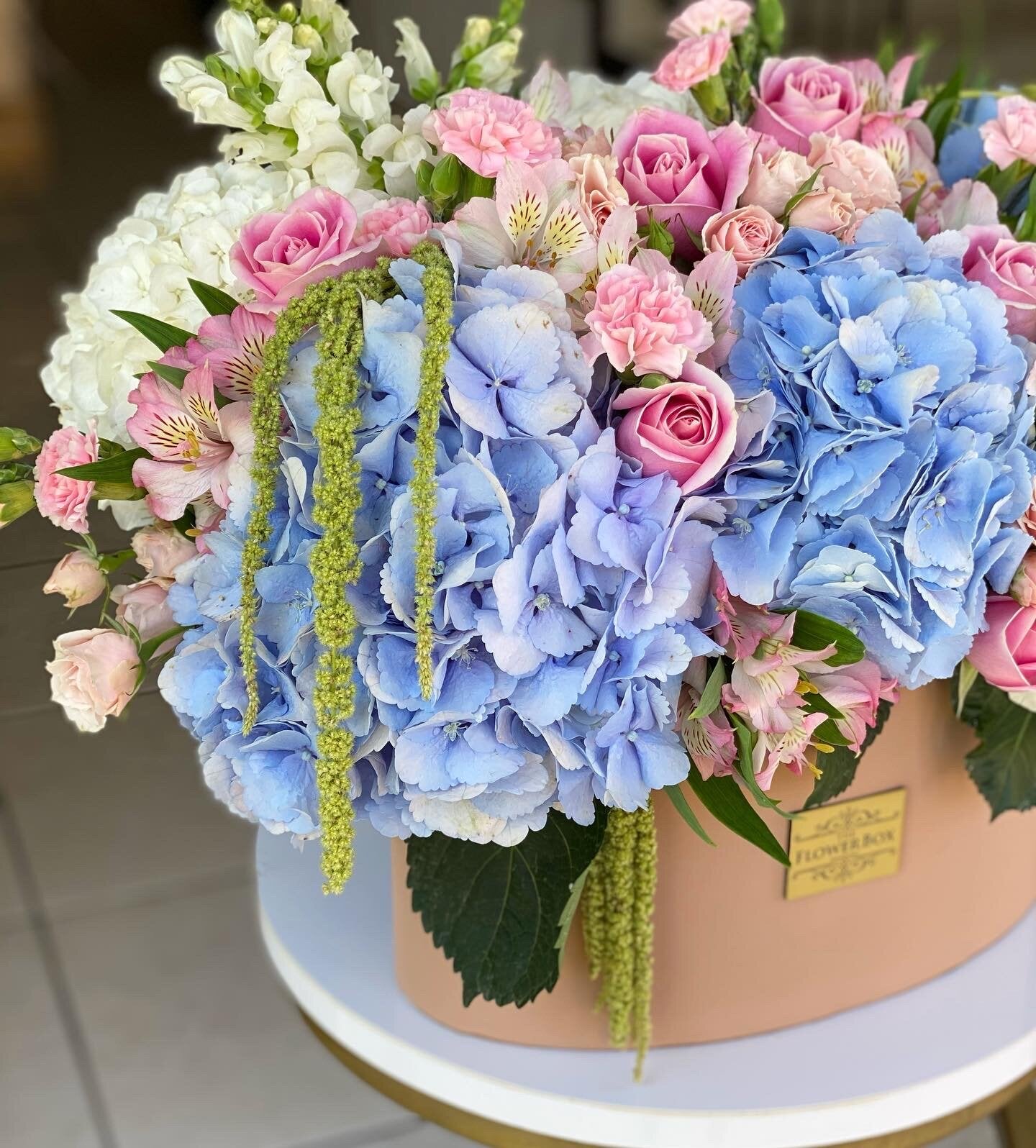 Nuestra caja “Sweet Jungle” disponible en una sofisticada caja de cuero beige con flores mixtas y frescas.
