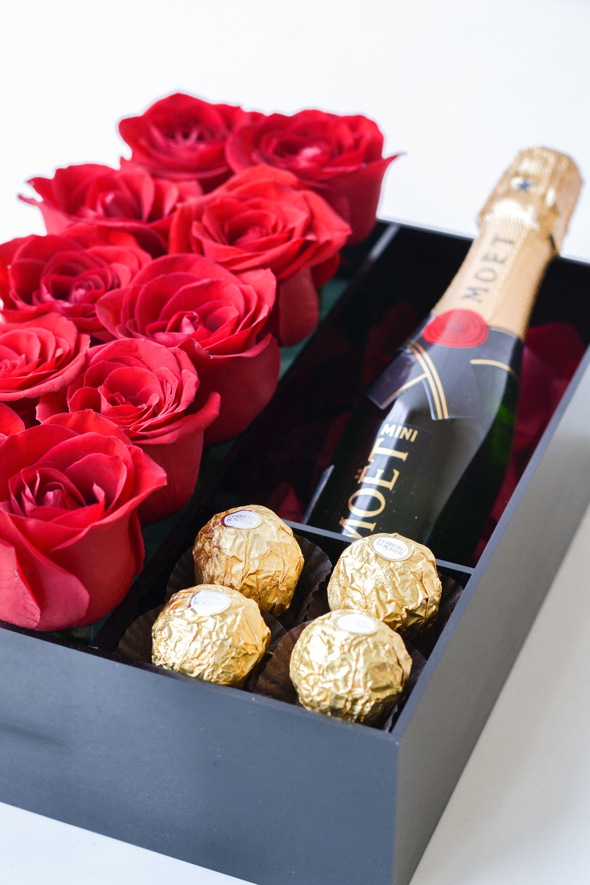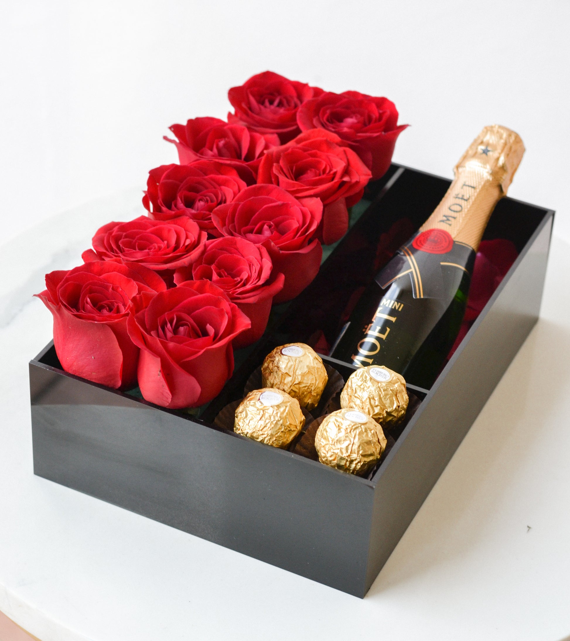 Nuestro arreglo está elaborado en una caja con rosas rojas una botella de Mini Möet (depende de disponibilidad).