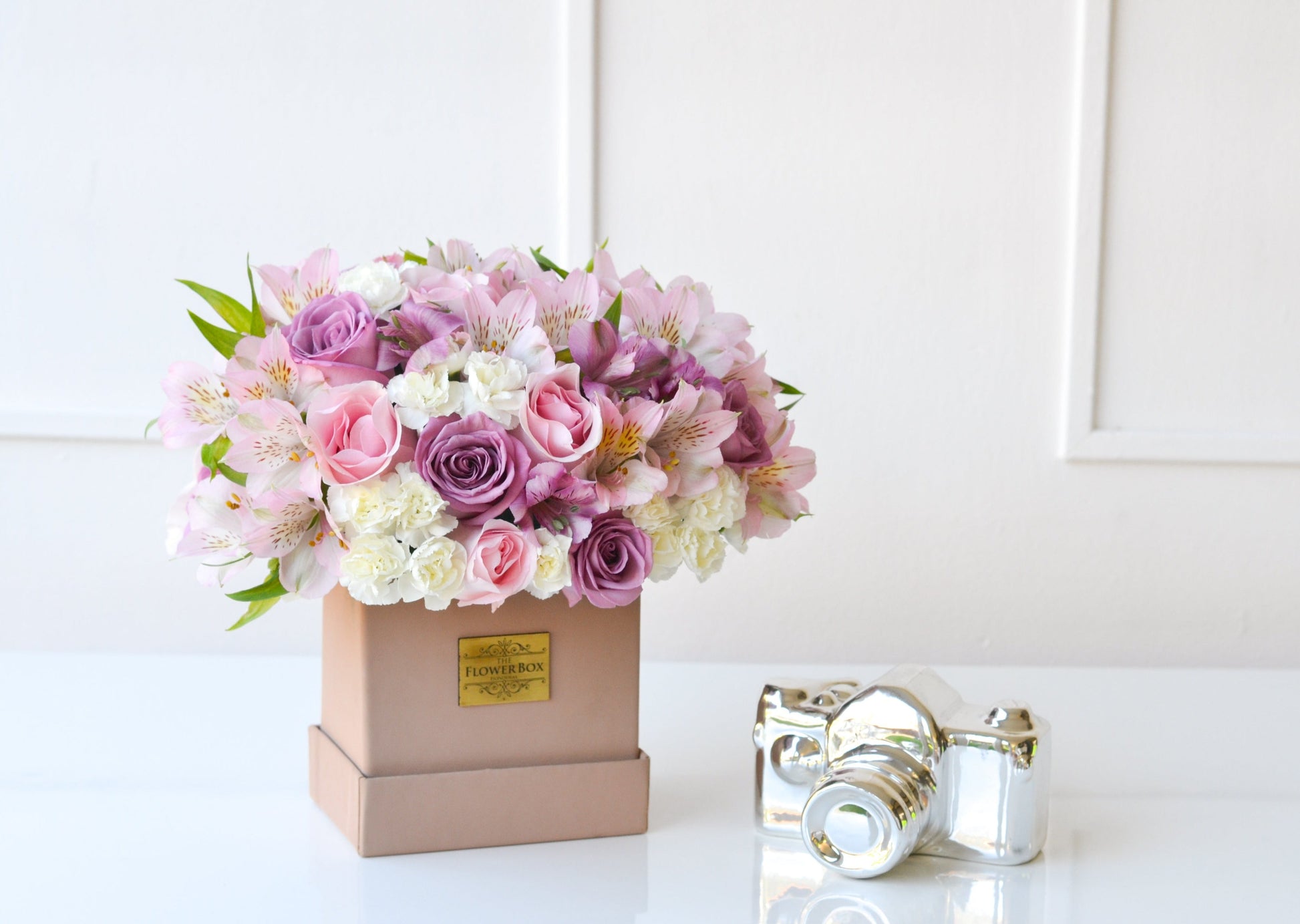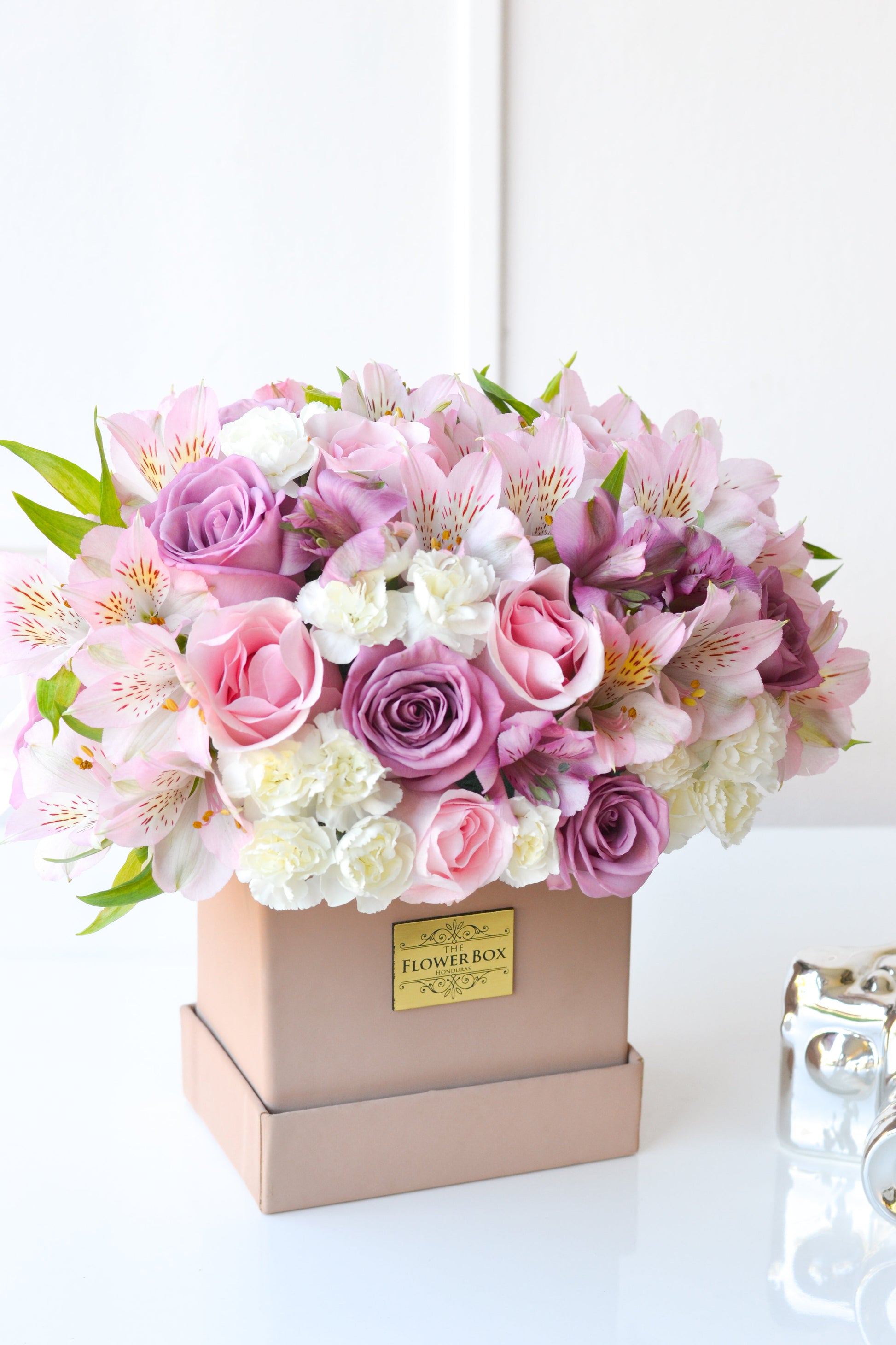 Nuestra caja “Sweet Nude” disponible en una sofisticada caja de cuero cafe en combinación con flores primaverales y tonos pasteles.