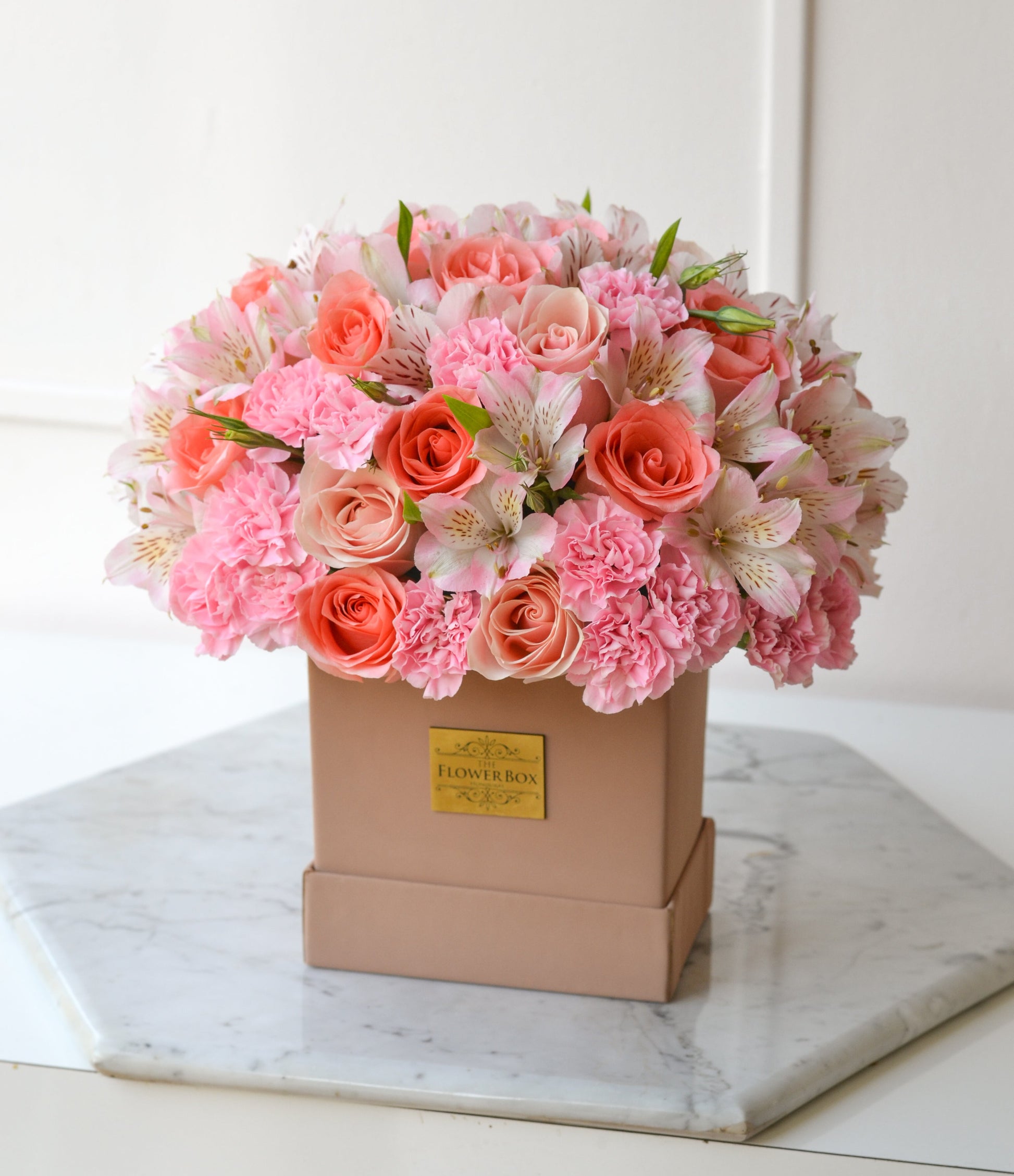 Nuestra caja “Sweet Peaches” disponible en una sofisticada caja de cuero peach en combinación con flores primaverales y tonos pasteles.