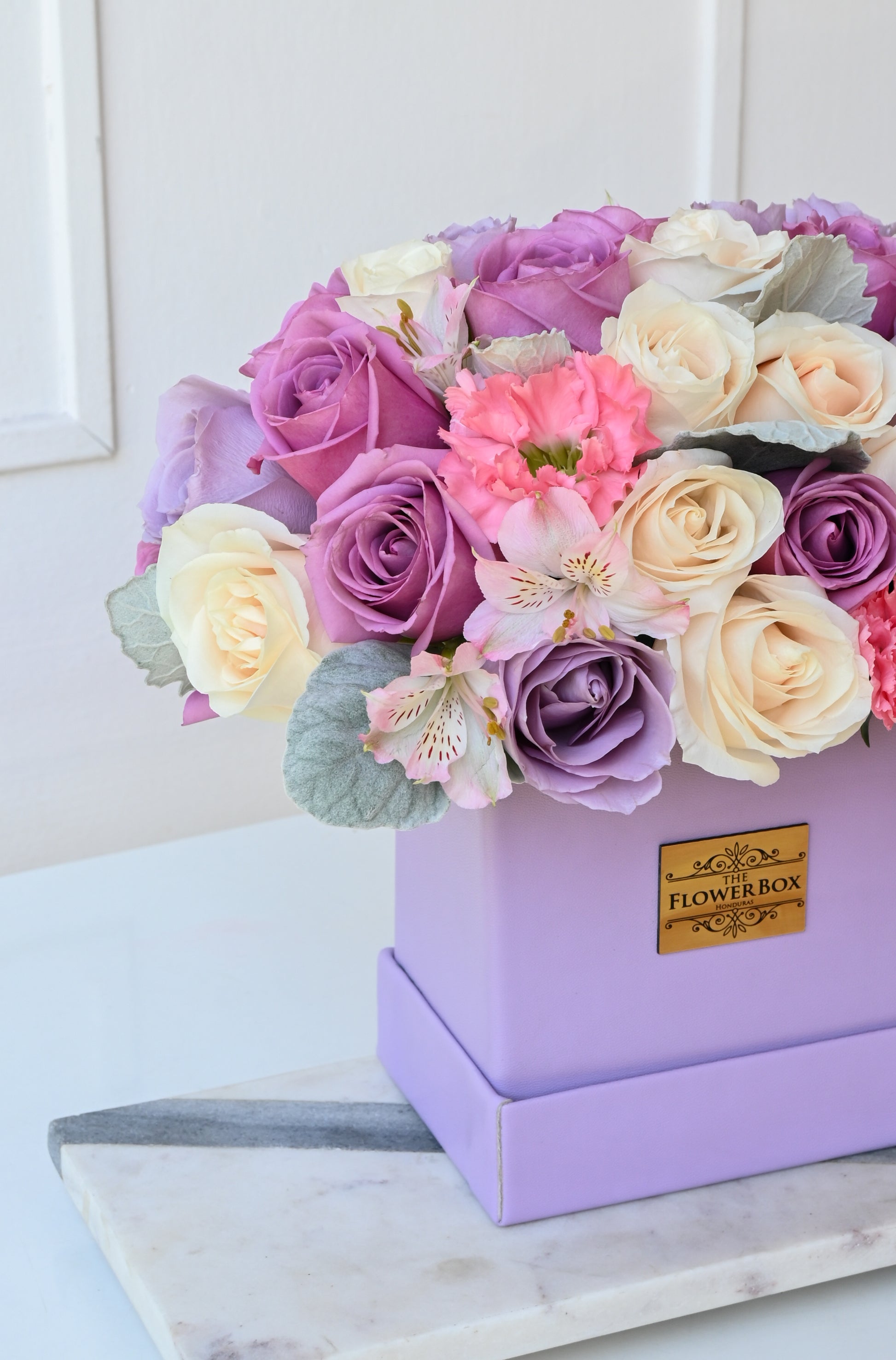Este arreglo floral en caja morada es perfecto para ocasiones especiales como cumpleaños, aniversarios, bodas, graduaciones, o simplemente para decir "te quiero" a esa persona especial en tu vida.