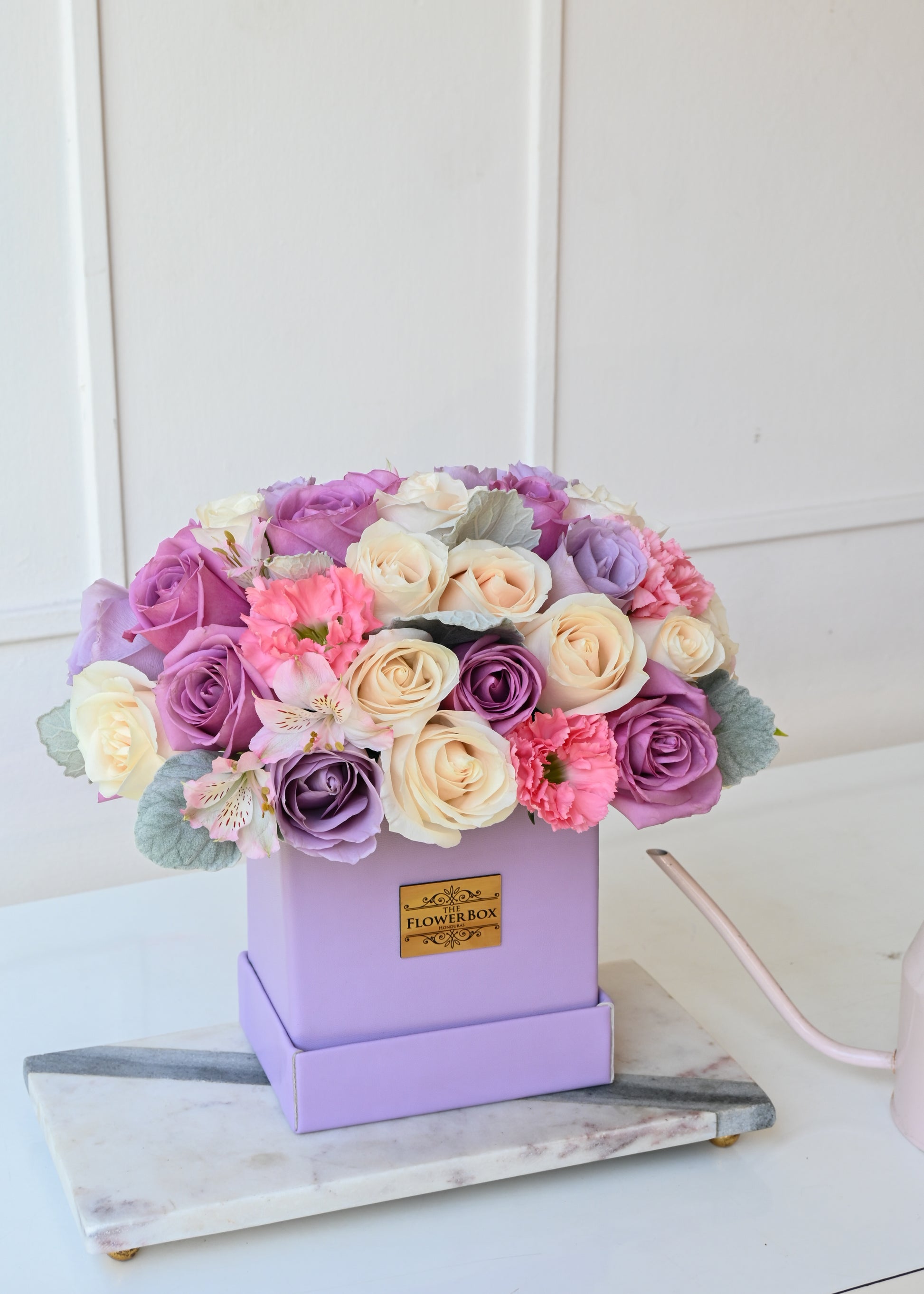 Este arreglo floral en caja morada es perfecto para ocasiones especiales como cumpleaños, aniversarios, bodas, graduaciones, o simplemente para decir "te quiero" a esa persona especial en tu vida.