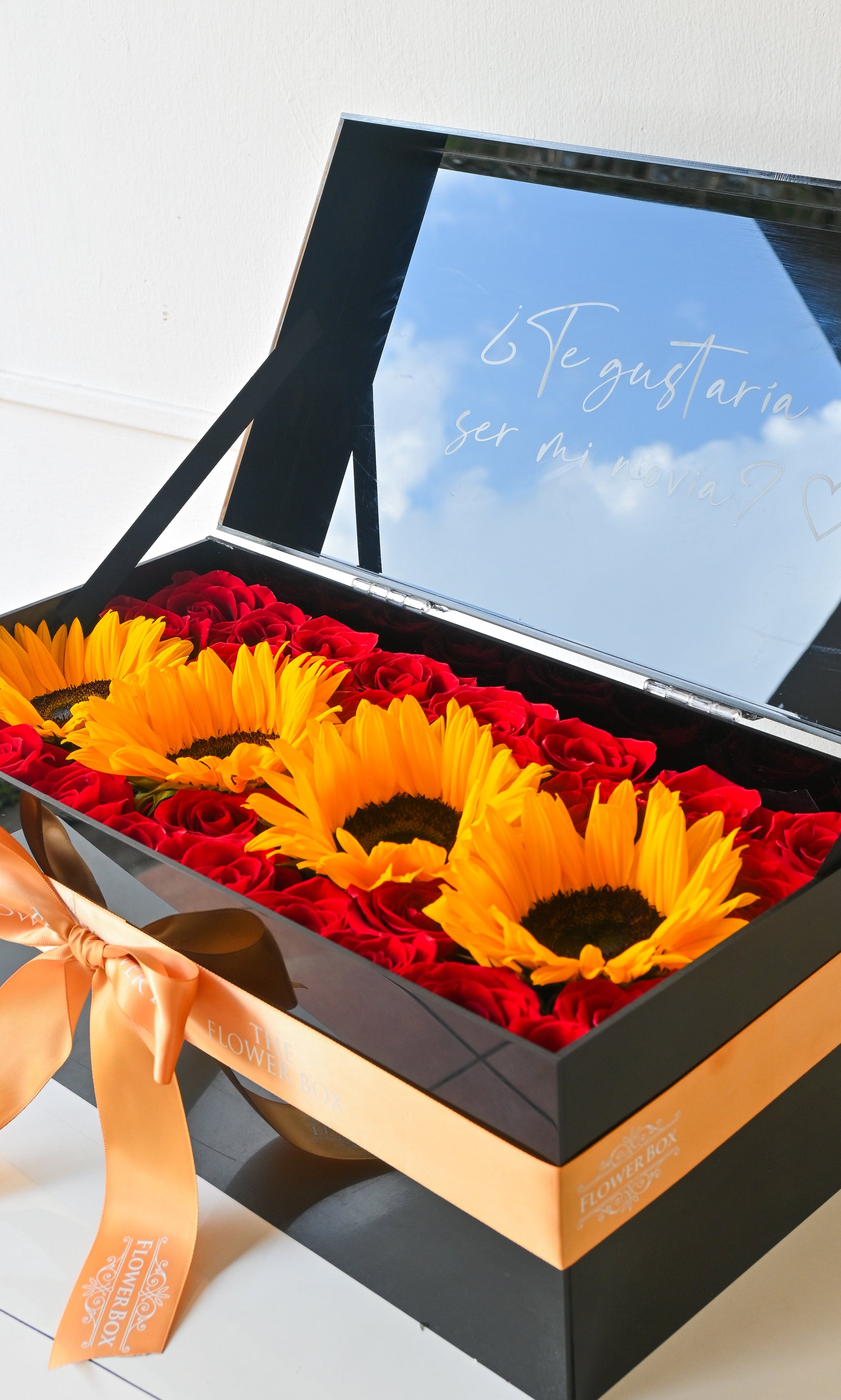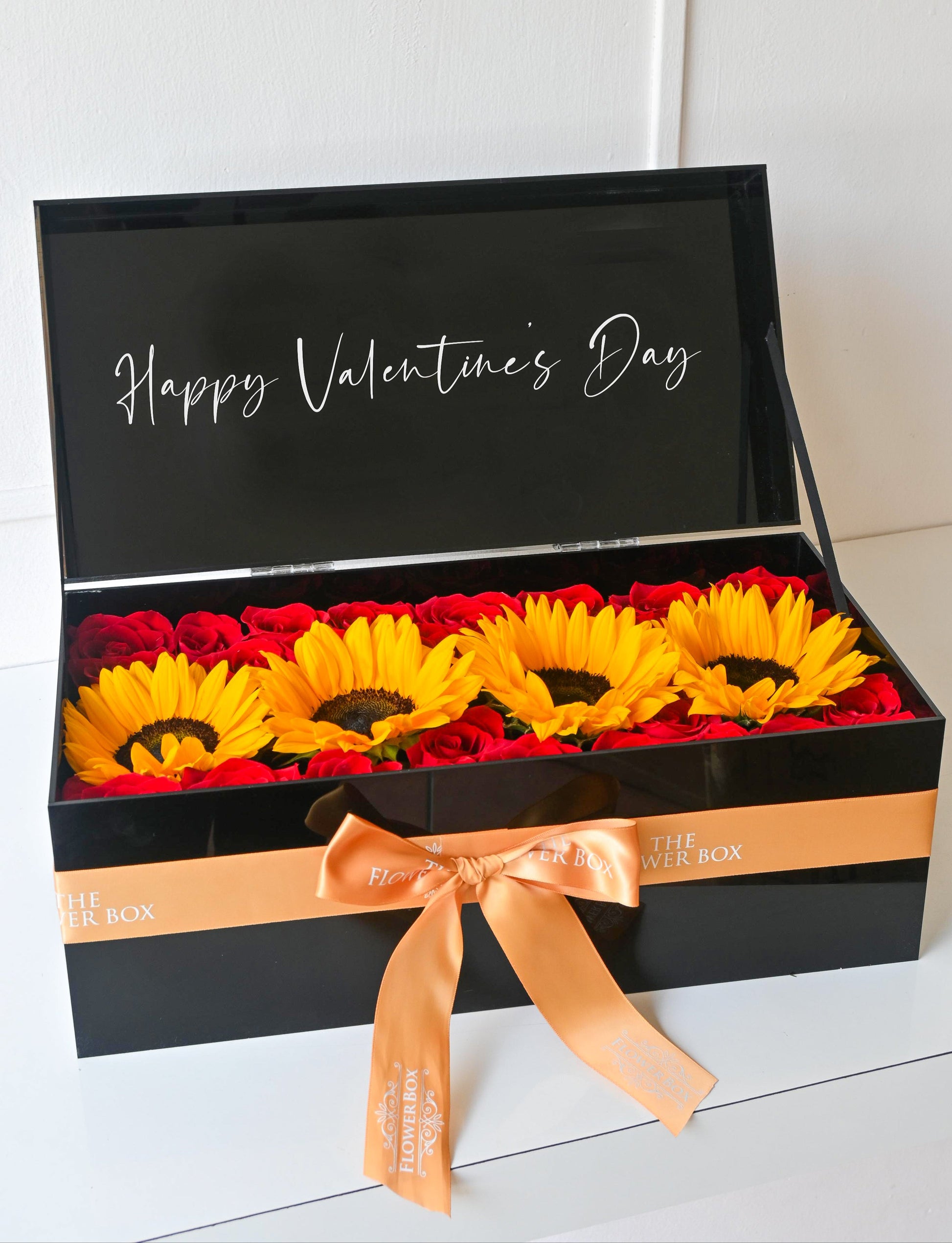 Ideal para demostrar tu amor en una frase y combinación de flores. Diseñadas con elegante acrílico negro, 3-4 girasoles y rosas rosas. Mensaje personalizado: Happy Valentine’s Day.