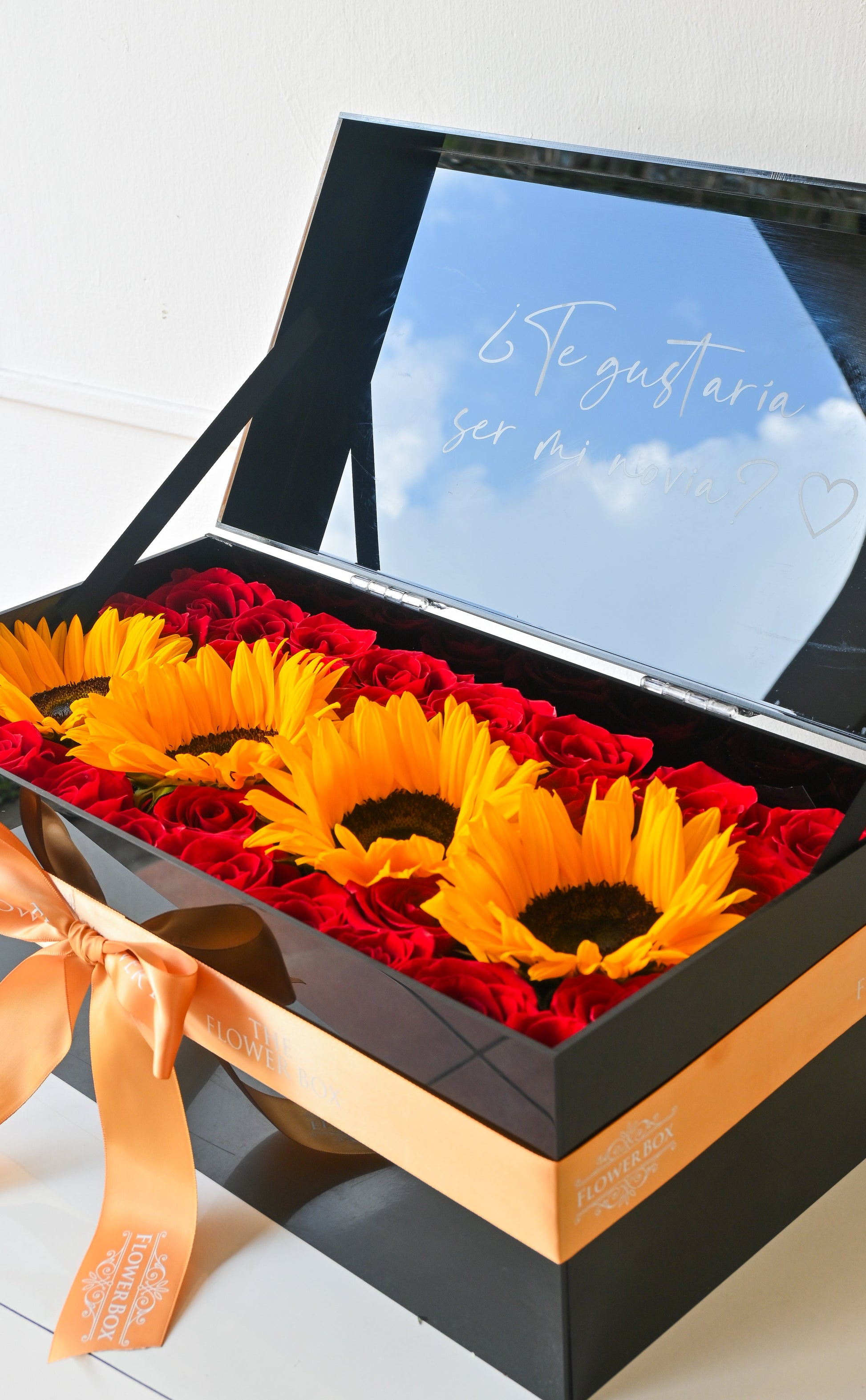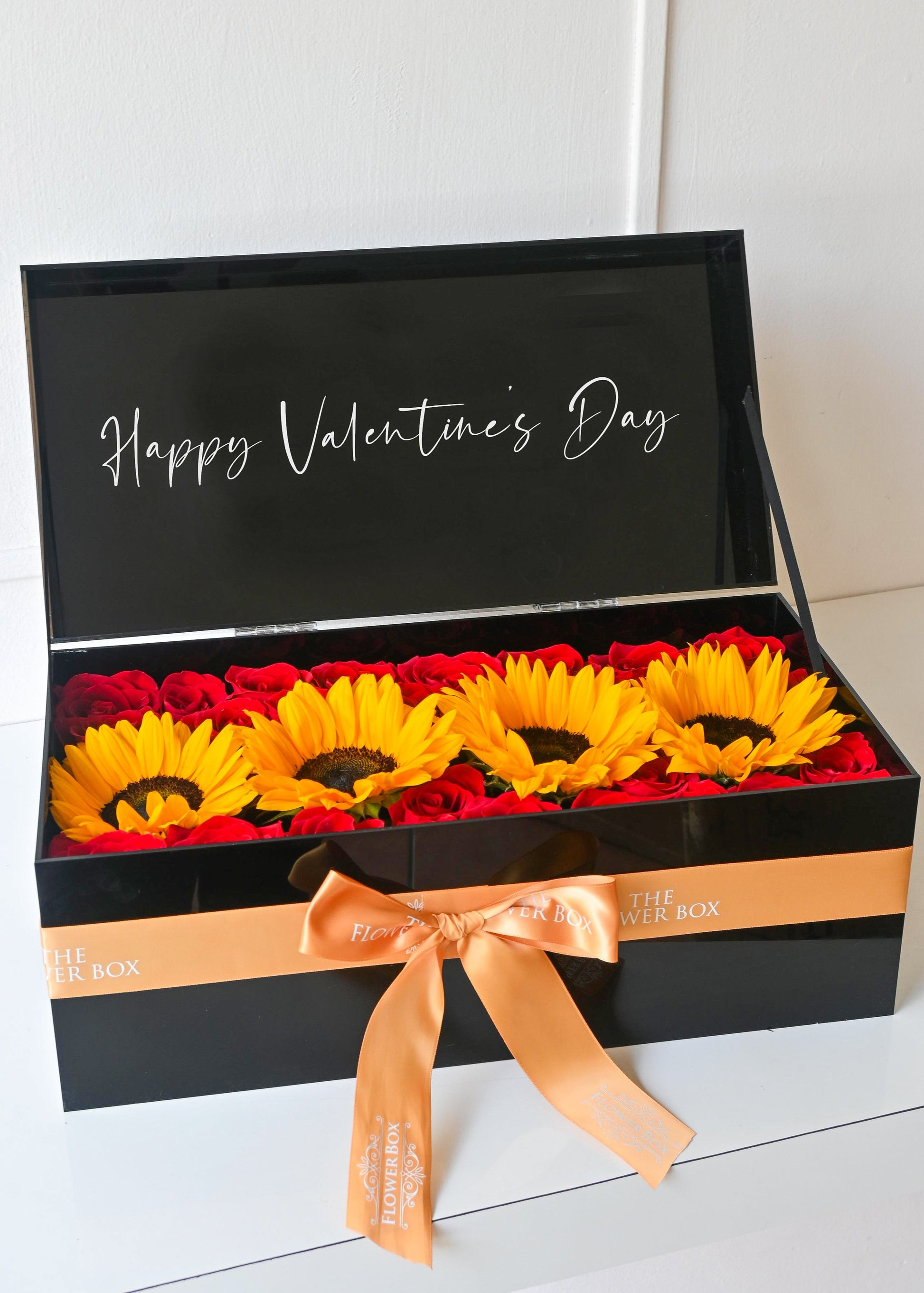 Ideal para demostrar tu amor en una frase y combinación de flores. Diseñadas con elegante acrílico negro, 3-4 girasoles y rosas rosas. Mensaje personalizado: Happy Valentine’s Day.