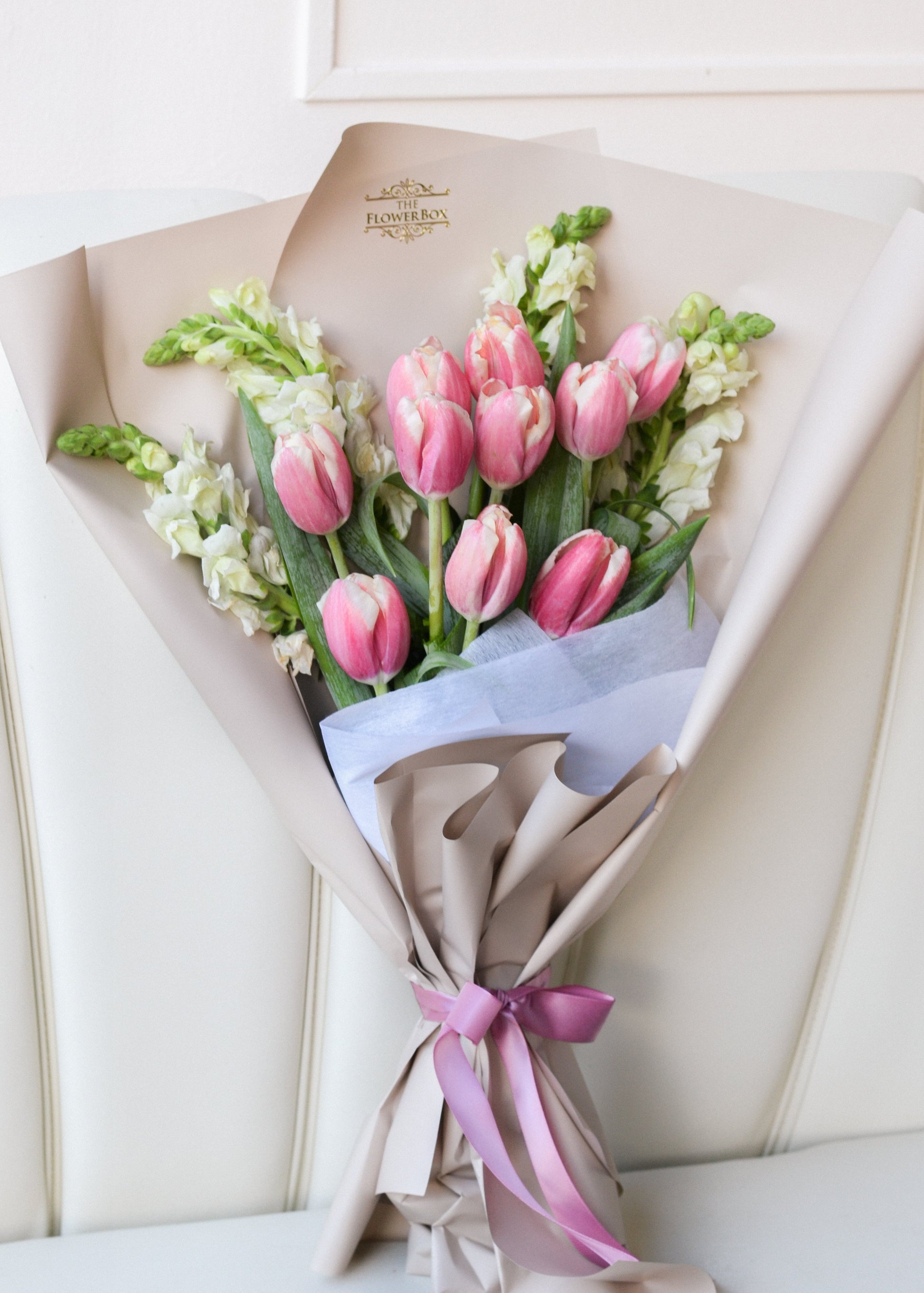 Nuestro hermoso bouquet de tulipanes frescos y boca de dragón acompañado de nuestro papel luxury color beige y cinta rosada.