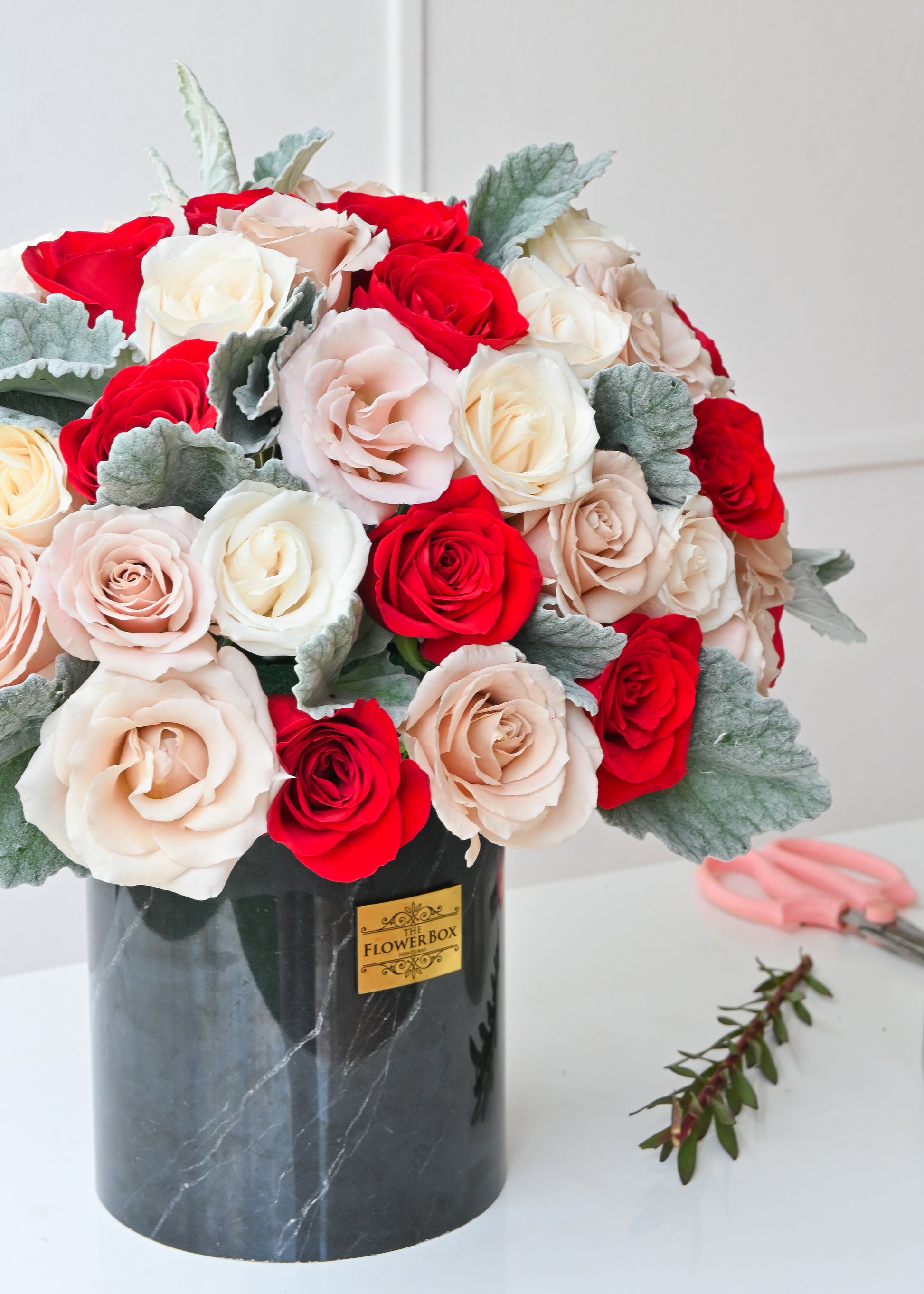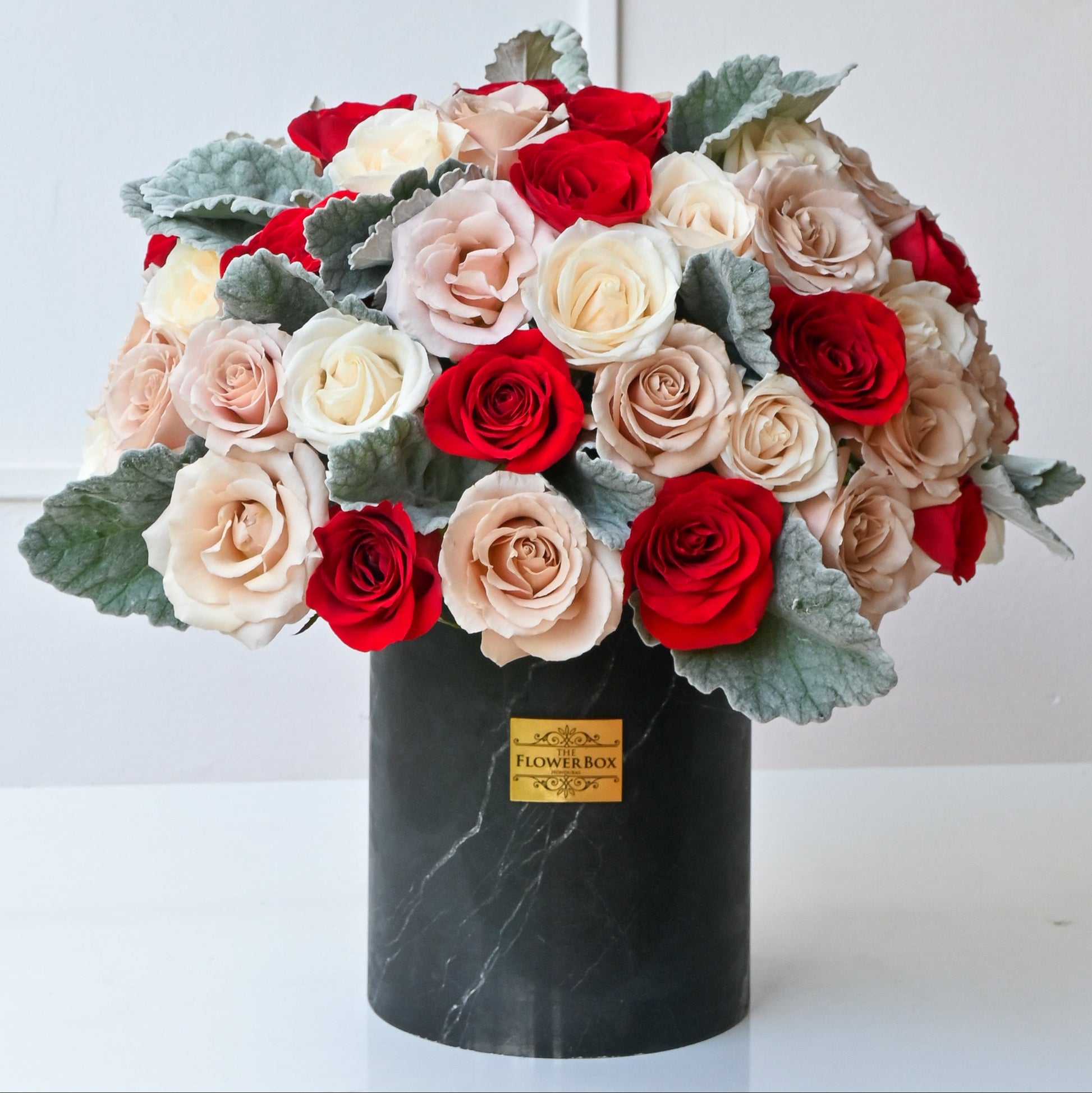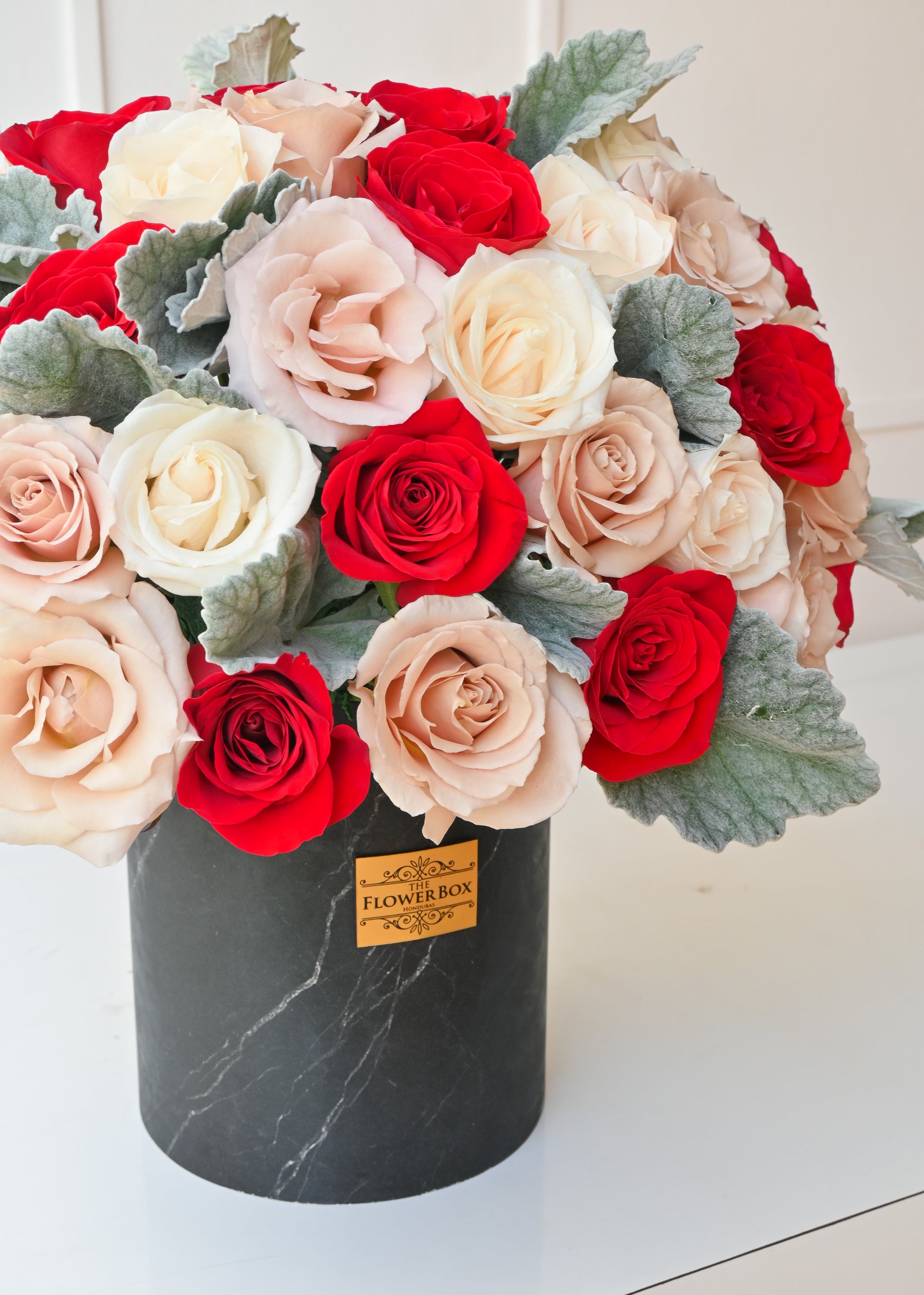 - Rosas rojas, rosadas y blancas, combinadas en perfecta armonía para simbolizar amor, dulzura y pureza.