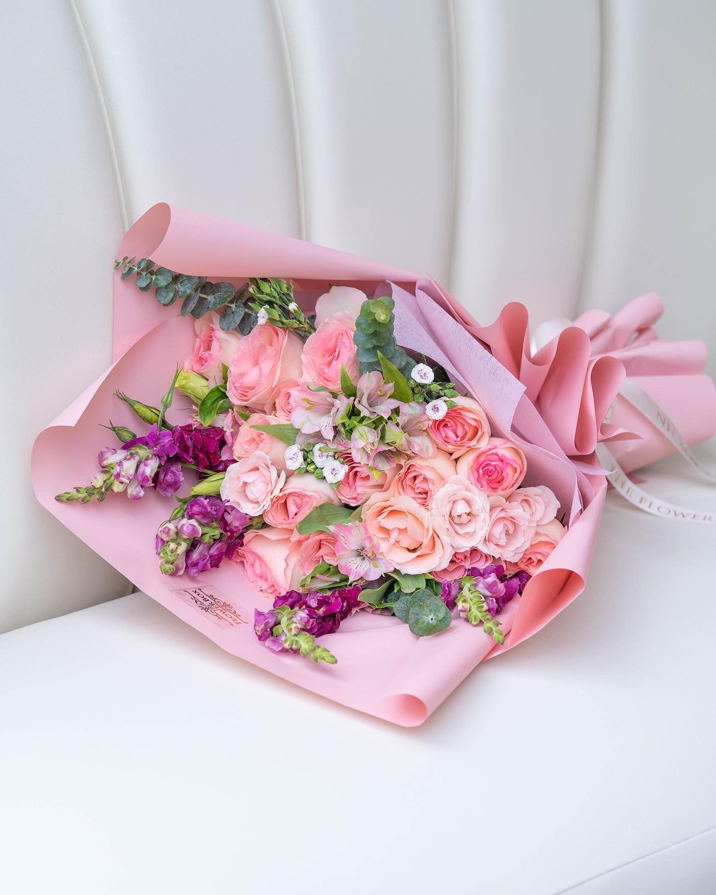 Charming bouquet con combinación de rosas rosadas suave, astromelias rosadas, detalles de snap dragon, raffine y eucalipto. ¡Perfecto para sorprender!