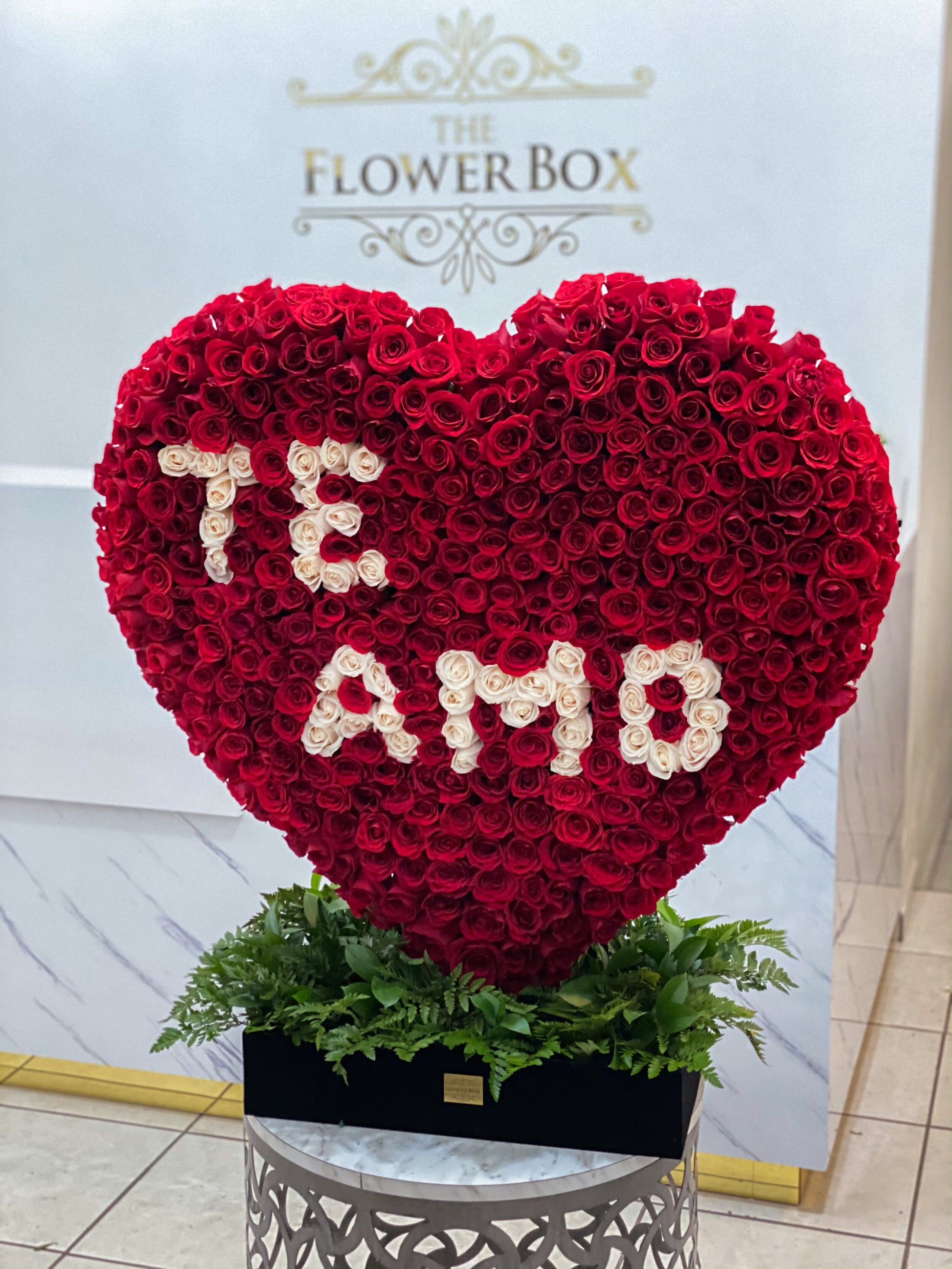 Nuestra caja “XXLove Heart” disponible en una sofisticada caja de cuerina negra y metal en forma de corazón con efecto 3D, diseñado en románticos tonos rojos y la frase “Te Amo” en rosas blancas.